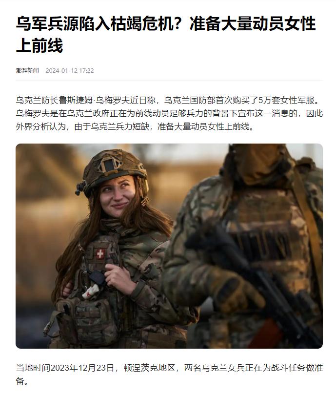 一名乌军女兵,在接受乌克兰电视台采访,被问到前线当下更缺人,还是更缺无人机时,她表示,前线最缺的是人,如今面临的最大问题,不是缺不缺人的事儿,而是人快打光了。 美国战争研究所(ISW)之前分析过,截至2025年初,乌军累计损失差不多70万人,开战初期那25万现役部队几乎打没了,后来靠一轮轮动员才勉强凑出88万兵力,但这点人根本填不满战线。 一些部队的编制人员缺口高达40%到70%,这意味着一个标准步兵营应有200多名士兵,但实际可能只有不到40名步兵在坚守阵地。 由于兵力不足,士兵们无法按时轮换,本应3天轮换一次的步兵现在需要在战壕里连续驻守更长时间。 一名乌军少将坦言:“我们人手不够,现有的士兵非常非常疲惫,几乎已经没办法坚守阵线。” 更令人担忧的是,新兵往往在没有接受足够训练的情况下就被派往前线。 一位营长透露,他的部队在过去5个月里只接收了5名新兵,这些缺乏经验的新兵在面对实战时往往手足无措。 随着战事持续,乌克兰的兵源问题愈发严峻。 为弥补兵力损失,乌克兰不断调整动员政策,动员年龄从27岁降至25岁,进而扩展到18岁青年,甚至近期已开始招募60岁以上的男性公民。 这一系列措施显示乌克兰兵源已接近枯竭。 目前,被动员入伍的乌克兰人年龄大多在40至50岁之间,乌军平均年龄已突破40岁。 这些老龄士兵身体条件和反应速度难以适应现代战争节奏,特别是面对无人机主导的高科技战场。 乌克兰还从监狱吸纳被定罪的犯人自愿入伍,同时颁布新规,允许感染某些疾病的人员在武装部队服役。 最明显的征兆是女性参军比例大幅上升。 乌克兰国防部首次购买了5万套女性军服,目前有超过6万名女性在乌军队中服役,约占武装部队人数的7%。 尽管官方声称新的《动员法》草案不包含“征召女性服兵役”,但具有医学或制药背景的女性已被要求登记。 这种趋势引发了广泛担忧,正如一位军事分析家所指出的:“当一场战争需要大规模征召女性上前线,通常意味着这个国家的兵源已经接近枯竭。 ”与此同时,乌克兰军队还面临严重的逃兵问题。 据今日俄罗斯电视台报道,俄乌冲突期间,有超过10万名乌军士兵开小差或擅离职守。 仅今年就有约6万名乌克兰人逃跑,占开小差总人数的一半。 士气低落的原因复杂多样,前线士兵与后方动员部门之间的矛盾日益突出。 一名乌军军官透露,士兵们普遍存在“不愿出任务”的情况。 同时,军队中腐败问题严重,征兵办公室存在收受贿赂、篡改名单的现象,导致富人逃避兵役,而贫寒子弟被迫送死。 兵力短缺的背后是乌克兰正在经历的严重人口危机。 战前乌克兰人口约4300万,如今已锐减至3700万左右。 适龄男性大规模流失,生育率跌破1.0,联合国数据显示乌克兰人口骤降千万。 这种人口结构的变化将对乌克兰未来产生深远影响。 欧洲理事会报告揭露的强征残疾人等系统性侵权问题,不仅引发伦理争议,也可能加剧社会分裂。 美国战争研究所的统计显示,今年9月,俄军平均每天能够攻占14平方公里的土地,面对持续的压力,乌军防线承受着越来越大考验。 曾几何时,乌克兰总统泽连斯基称乌军仅有3.1万名士兵牺牲,但西方情报机构普遍认为这一数字被严重低估。 而俄罗斯国防部长绍伊古则声称乌军已损失超44万人。 无论哪一方的数据更接近真实,都无法掩盖一个基本事实:乌克兰已经为这场战争付出了巨大的人口代价。 一位乌克兰老兵曾警告说:“动员妇女参军的好处很少,但伤害巨大,这可能让孩子们失去母亲。” 当60岁老人都被征召入伍,当女性成为战场上的常见面孔,我们不得不思考:这场冲突的终点究竟在哪里?