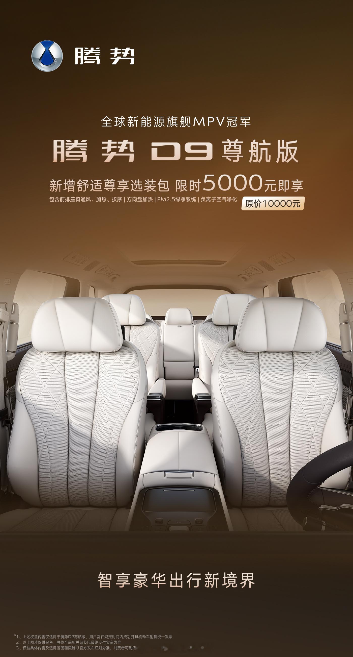 腾势D9尊航版加了个“舒适尊享选装包”,限时半价5000块大洋(原价1万)。这岂不是在本来就香的基础上更香啦[吃惊][吃惊][吃惊]