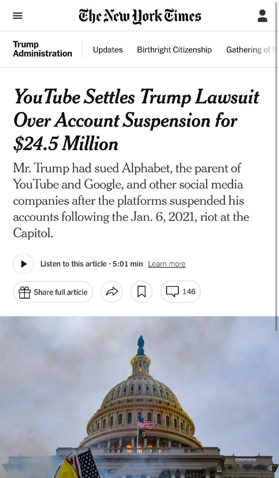 笑不活了,特朗普与油管达成协议,油管赔偿特朗普2250万美元,折合人民币1.5亿