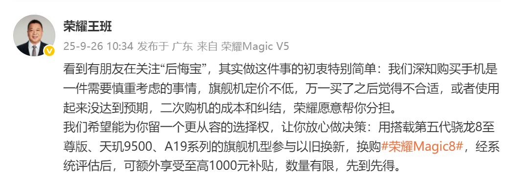 掀桌子了,友商估计心里在骂街,荣耀下手太狠了! 今年手机行业竞争太激烈了,iPhone17出了高刷新,国内友商直板手机推出副屏,看得出来大家压力都很大。可正是因为百花齐放,有些人可能图新鲜,买了手机过两天就后悔了,没法退货怎么办?荣耀下狠手了,前两天推出“后悔宝”服务,就是你买了友商手机后悔了,退不掉不用怕,直接换成荣耀Magic8系列最高补贴1000元。 指定机型估计也是新出来的手机,如果卖二手至少要亏一两千,荣耀这里不仅可以回收,再加上补贴,可能和新机原价差不多。等于不亏钱就能换成更喜欢的荣耀Magic8系列,甚至还赠送一年碎屏保、一年后盖保权益,再加上荣耀手环9和两年电量宝,别说亏钱了,说不定还能赚钱。估计友商心里很急,荣耀这不是掀桌子吗?估计下个月有不少人要用新机换成荣耀Magic8系列。