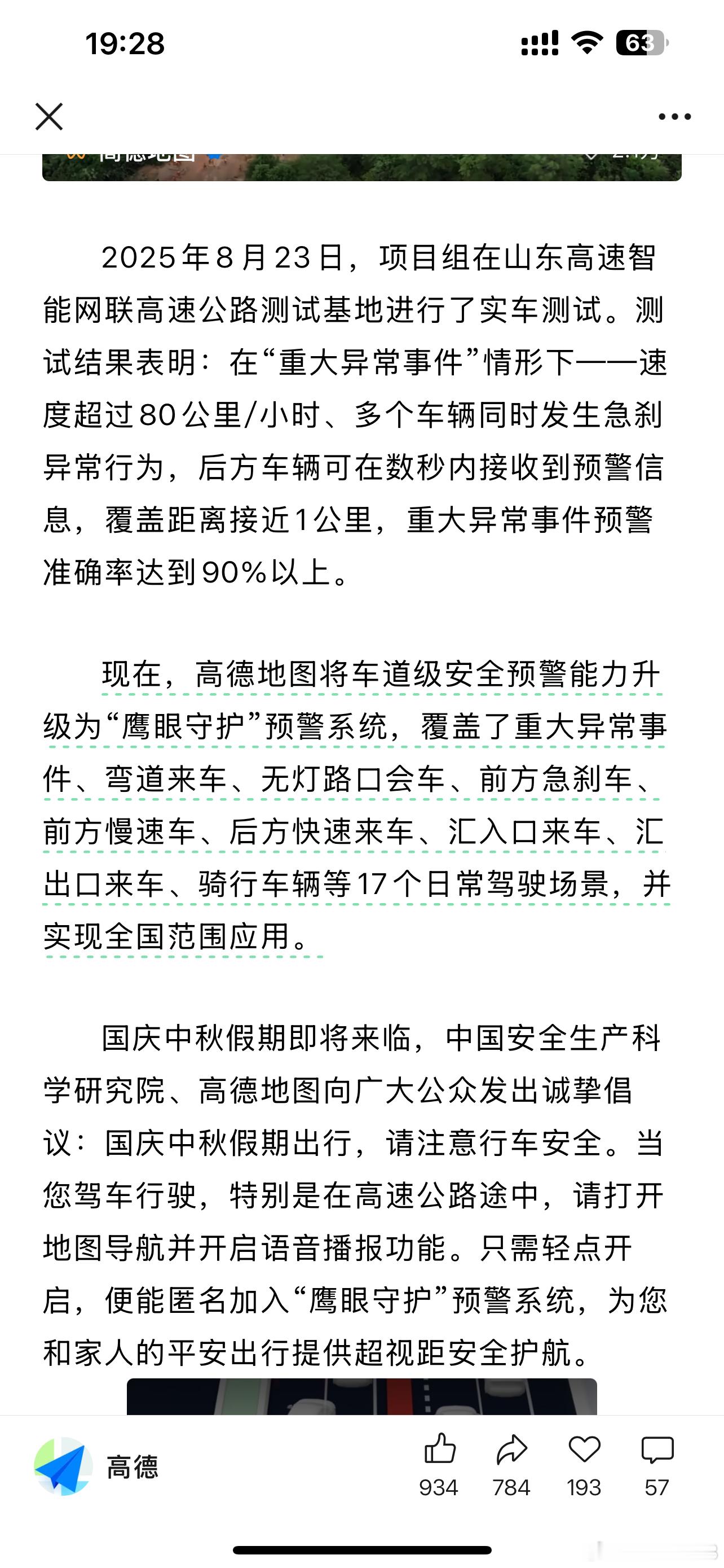 今天下午开始,道路上国庆中秋假期的繁忙就开始了,交通事故与堵车成了道路主旋律,使用高德可提前对复杂道路的状况进行预警,覆盖了重大异常事件、弯道来车、无灯路口会车、前方急刹车、前方慢速车、后方快速来车、汇入口来车、汇出口来车、骑行车辆等17个日常驾驶场景。