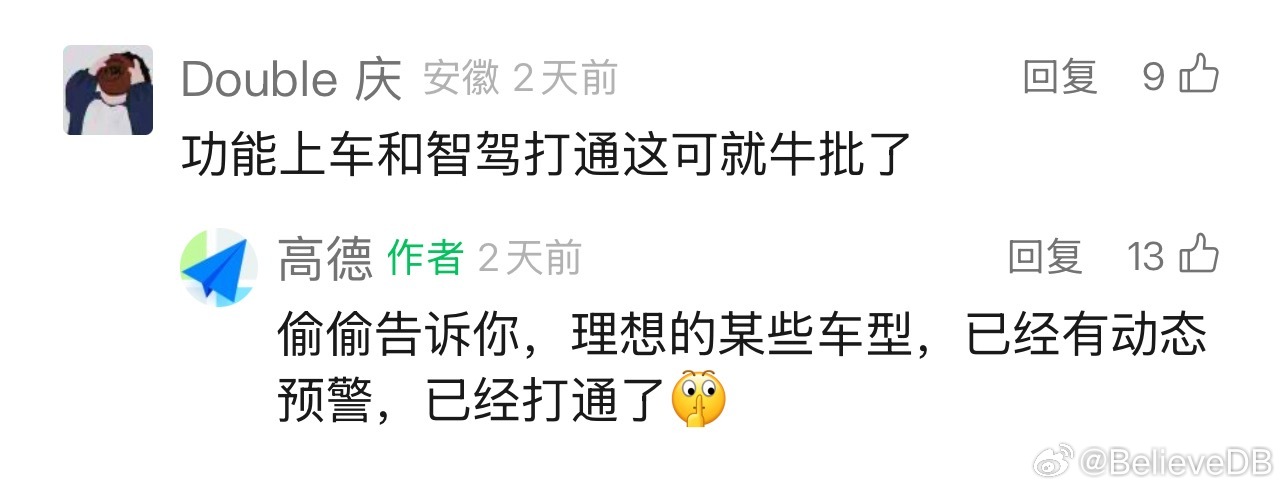 有人提议实现预警与智能辅助驾驶打通,高德官方回复,理想的部分车型已经有了动态预警,这样就能提前做出变道甚至提前减速,大家猜猜是理想哪些车型[坏笑]