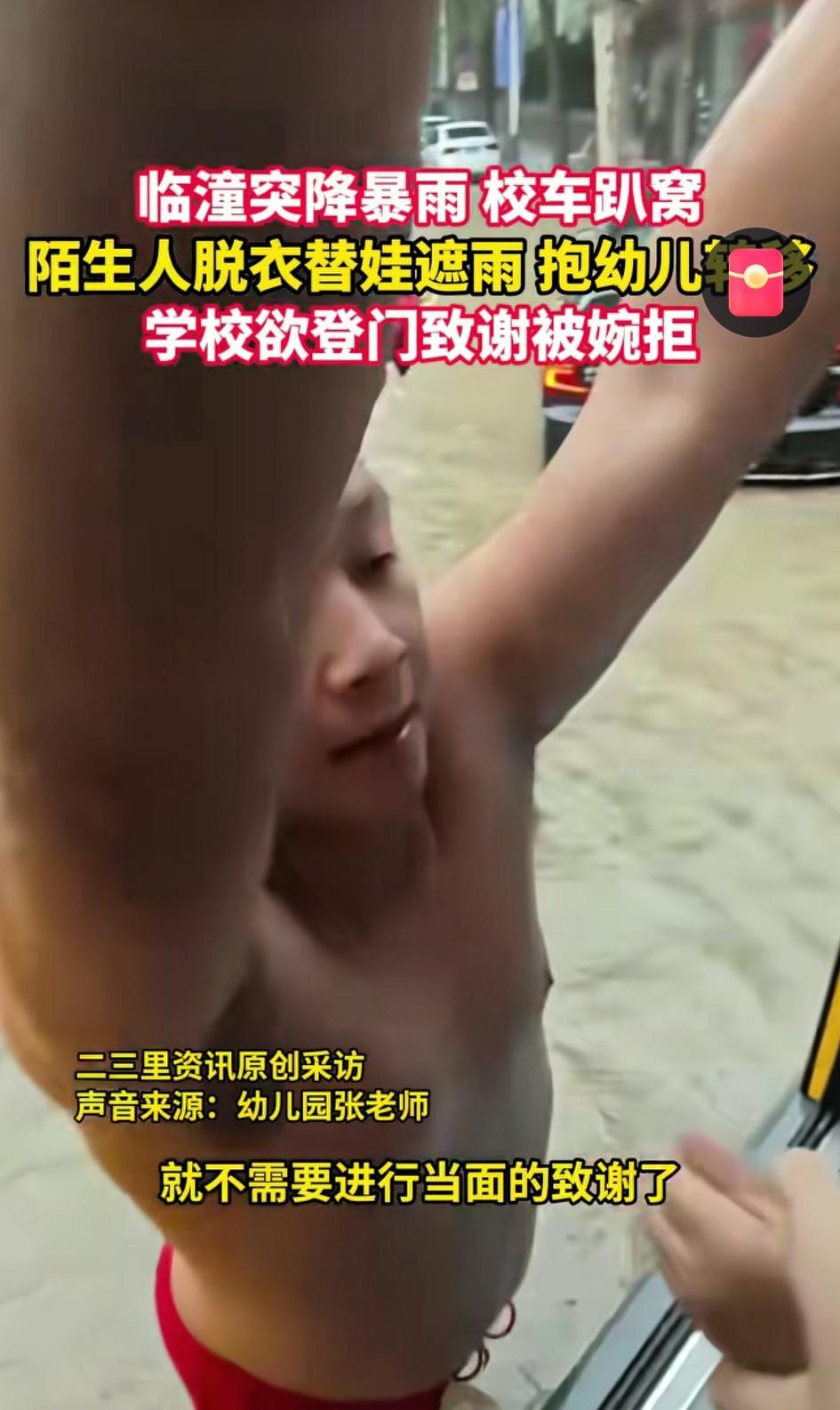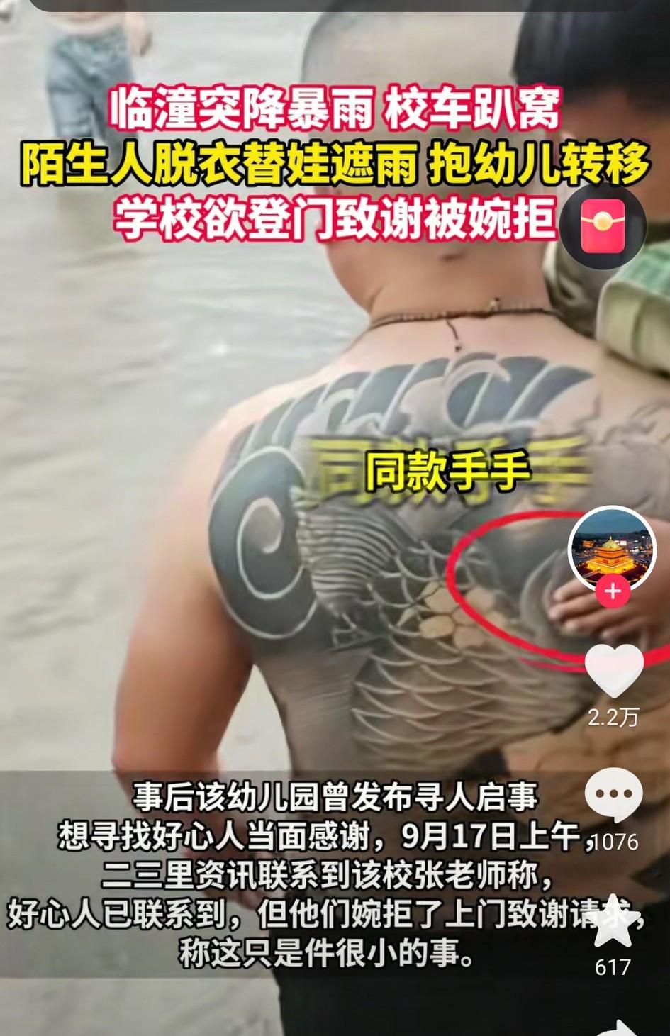 大庭广众之下,这几名男子裸露上身,特别是有一位男子还纹了身,乍一看,还以为是什么坏人。 让人意外的是,他们之所以裸露上身,是因为临潼突降暴雨,街上积水严重,装满幼儿的校车出了故障,趴了窝,车上的孩子们急需转移到安全处。 这几名男子脱下自己的上衣,来为孩子遮挡风雨,一趟一趟的涉水而行,把孩子们全部转移后,悄然离去。 事后,幼儿园发布寻人启事,也联系上了好心人,但他们均婉拒了学校上门感谢,表示顺手而为的小事,不值得感谢。 和平年代,没有那么多催人泪下的英雄故事,这些人们以为的小事,随意抛洒下的善意,却一点一点的碰撞人灵魂深处,让人不设防的被温暖。 半裸男