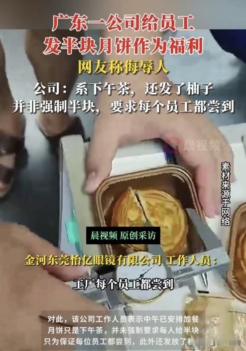 世界上最节俭的老板,有人说这么孤寒的公司,也有人说至少他们发了,我们是一毛不拔啊。 有网友发视频说公司发中秋月饼,发半个,有的公司发一盒,有的发散装的,有的更是一堆东西;但是发半个月饼确实是第一次听说。 发个月饼电子秤和卡尺都用上了,够奇葩的,要是不想发可以不发啊,用得着这样吗?会稀罕那半个吗。 工作人员回应是想每个人都尝一下 大家怎么看待发半个月饼这种行为呢?