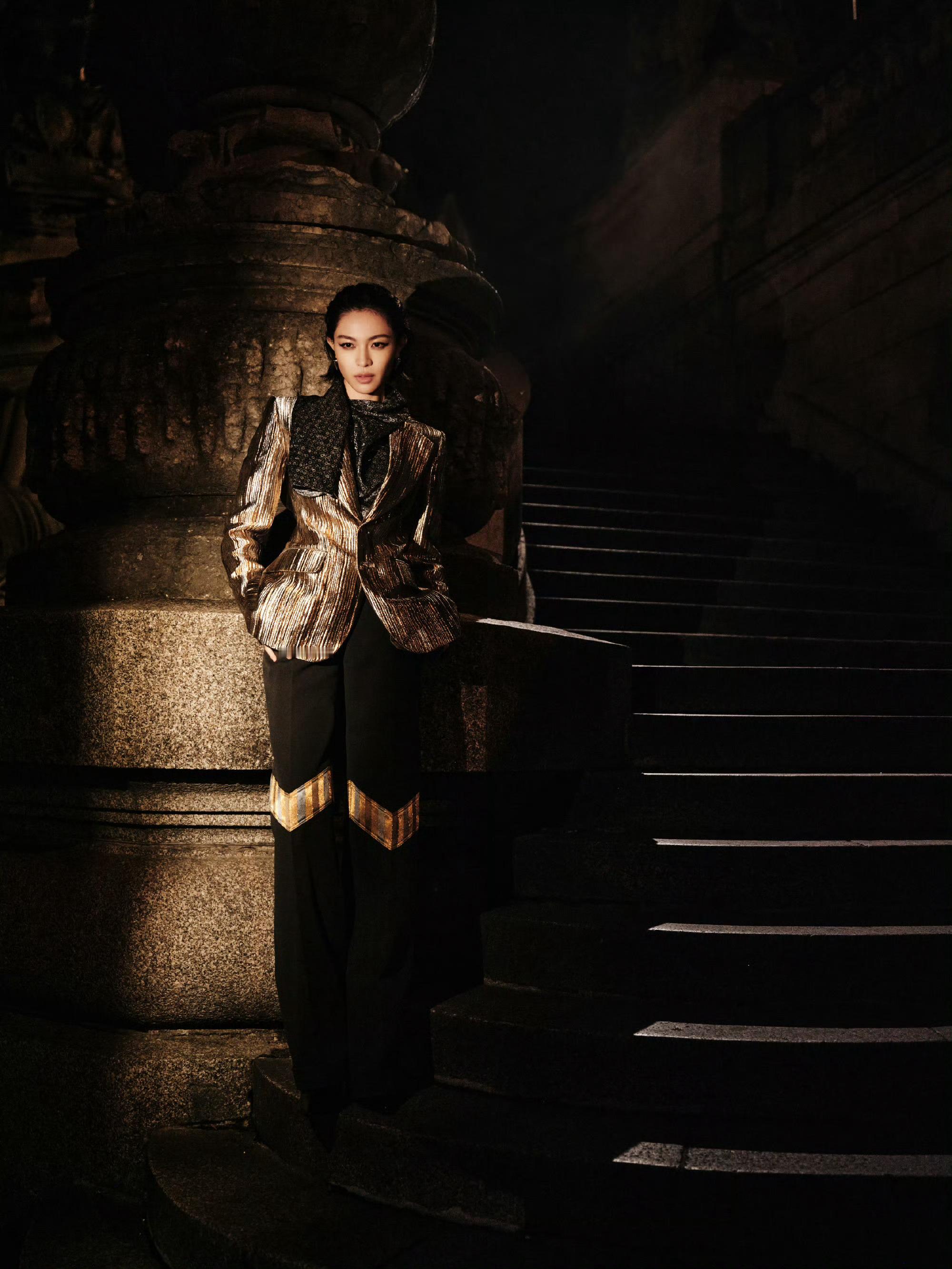 钟楚曦身穿Louis Vuitton黑金条纹西装(Resort 2026系列)亮相LV 2026春夏大秀