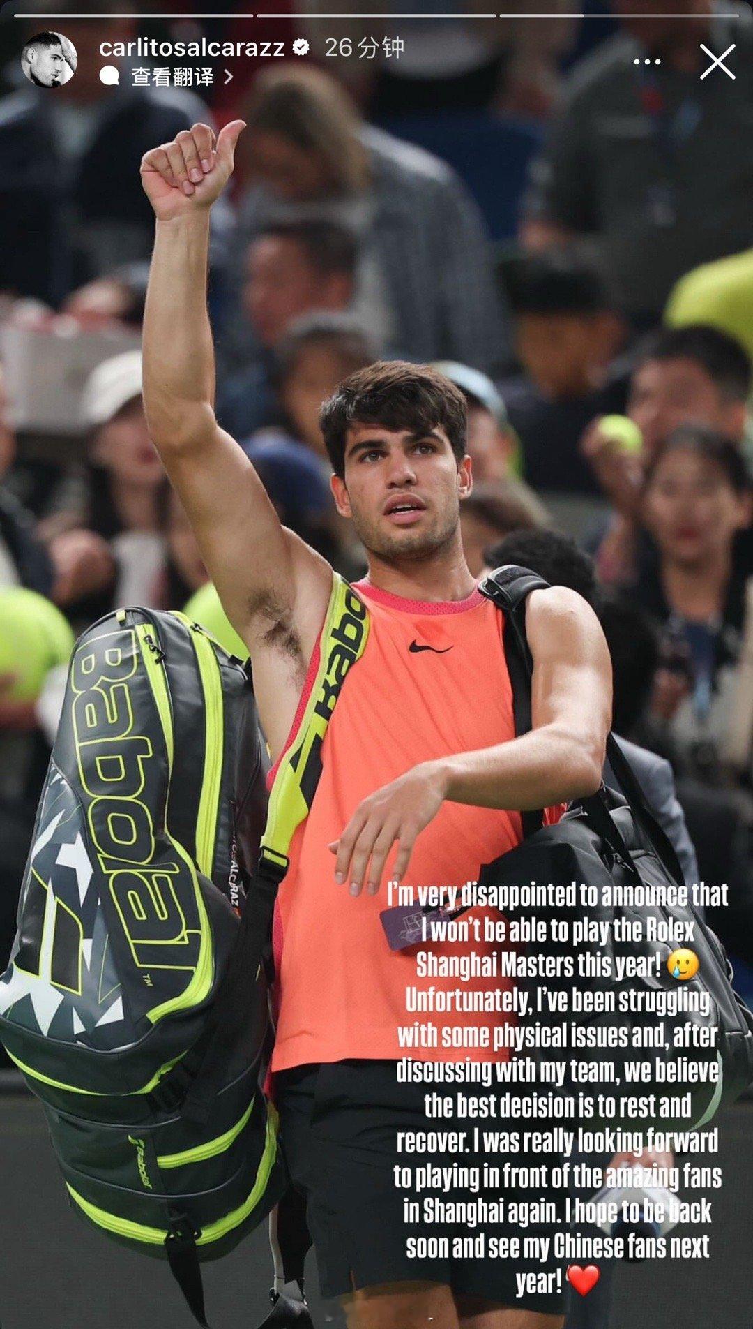 阿尔卡拉斯因伤退出上海大师赛[伤心]