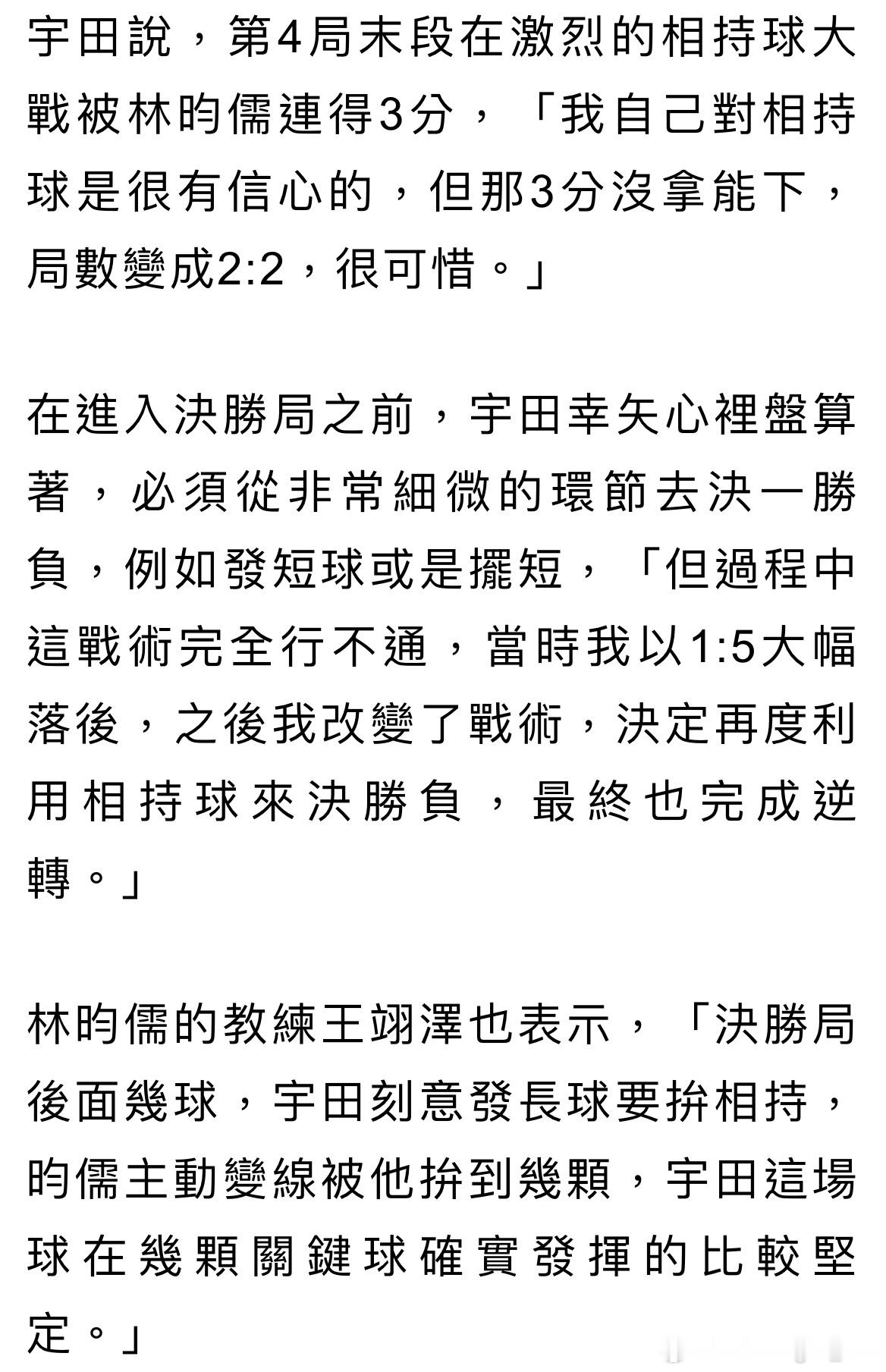 林昀儒的教练王翊泽也表示,「决胜局后面几球,宇田刻意发长球要拼相持,昀儒主动变线