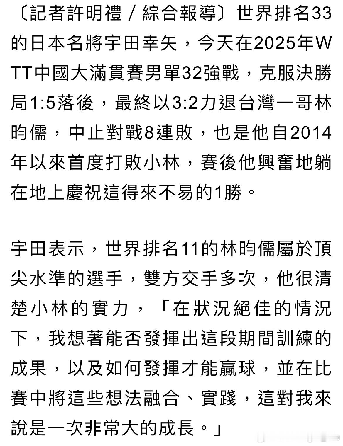 林昀儒的教练王翊泽也表示,「决胜局后面几球,宇田刻意发长球要拼相持,昀儒主动变线被他拼到几颗,宇田这场球在几颗关键球确实发挥的比较坚定。」