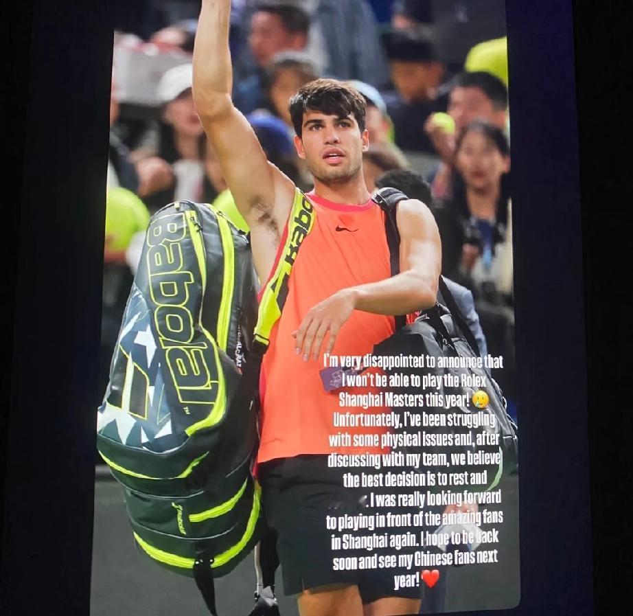 突发,阿尔卡拉斯退出上海大师赛,本届上海大师赛将不再有“鸡鸭大战”或者“辛纳决”了! 这是阿卡ins快拍发的,大概意思是身体有恙,所以退出本届上海大师赛,下一年中国再见! 这几天太多因伤病退出比赛的了,最早的萨巴伦卡、昨天的郑钦文、穆塞蒂、布瓦松,今天的梅总,现在又是阿卡。归根结底还是一年到头网球赛事太多,特别是这些顶尖球员,1000赛事强制参加,他们很多又都是能打入深轮次,特别是阿卡、辛纳、萨巴伦卡、斯瓦泰克这些球员。这方面,还是斯瓦泰克最牛逼,好像从来不会受伤的样子。 德约突然官宣参加上海大师赛,本来中国球迷又可以欣赏德约和阿卡、辛纳这两位年轻巨星同场竞技了。这下好了,阿卡退赛了。以后国内赛场大概率看不到他们三位一起比赛了!