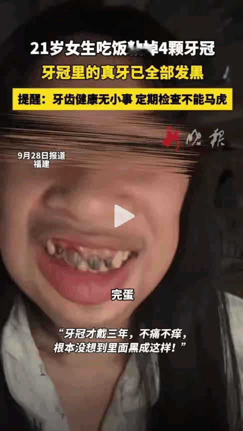 天塌啦! 福建一年仅21岁的女生,吃个饭竟然粘掉了4个牙冠。更令人头皮发麻的是