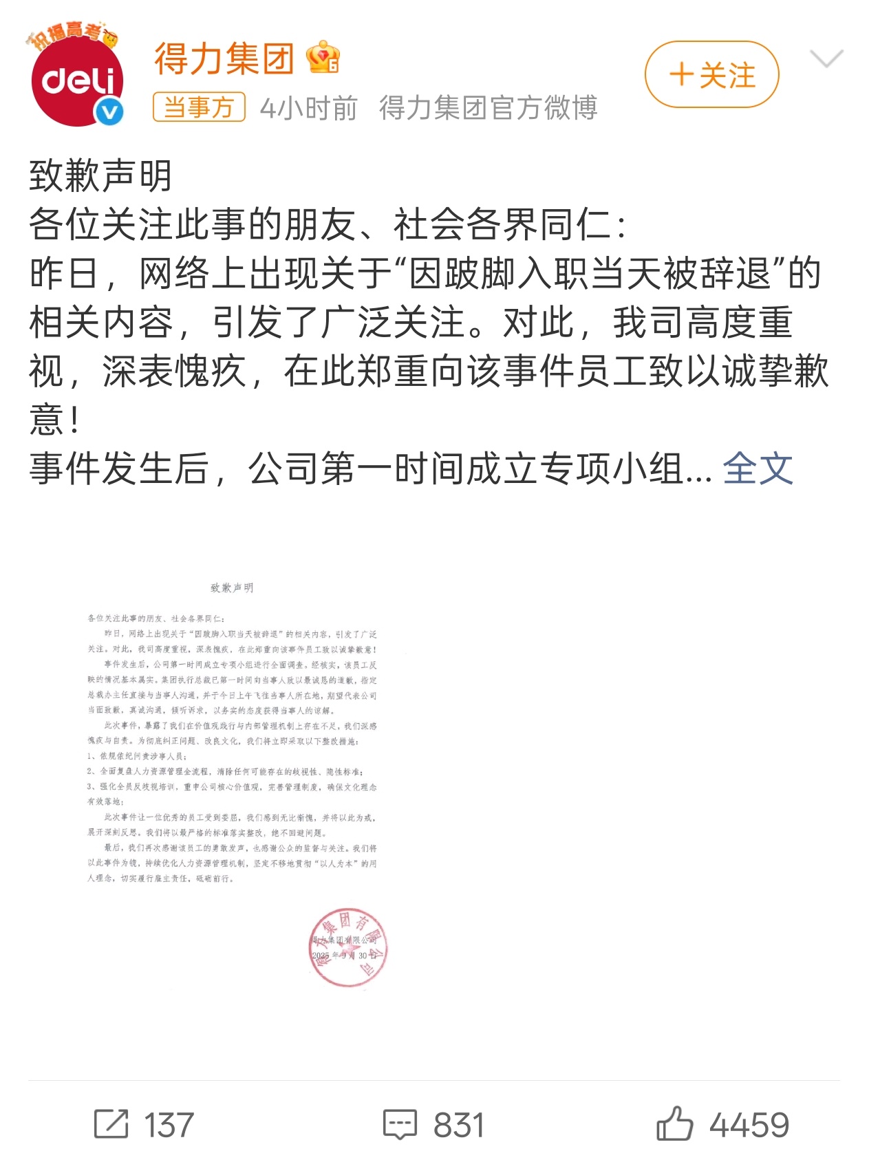 得力集团发致歉声明 比起前几天那家,得力的反应算是比较快了