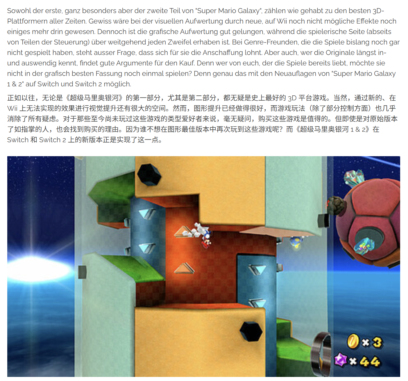 GAMES.CH给出了86分的评分,他们认为《超级马力欧银河1+2》的尤其是2,无疑是史上最好的3D平台游戏。当然,通过新的、在Wii上无法实现的效果进行视觉提升还有很大的空间。然而,图形提升已经做得很好,而游戏玩法(除了部分控制方面)也几乎消除了所有疑虑。毫无疑问,购买这些游戏是值得的。但即使是对原始版本了如指掌的人,也会找到购买的理由。