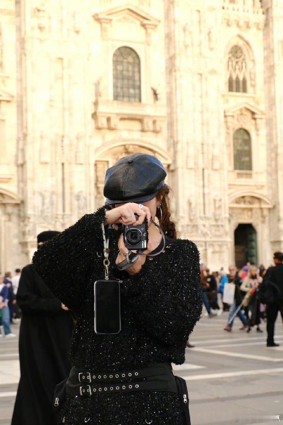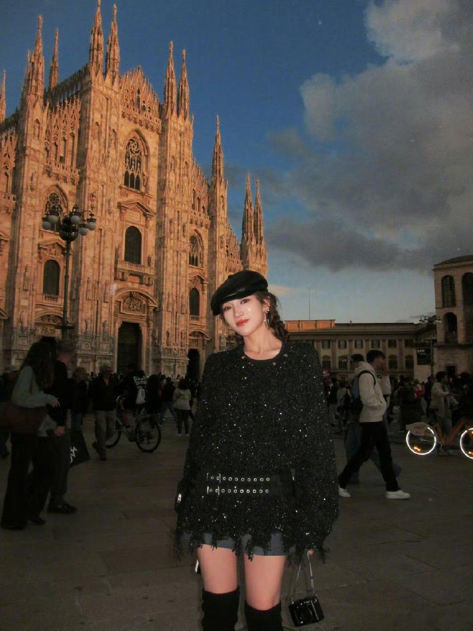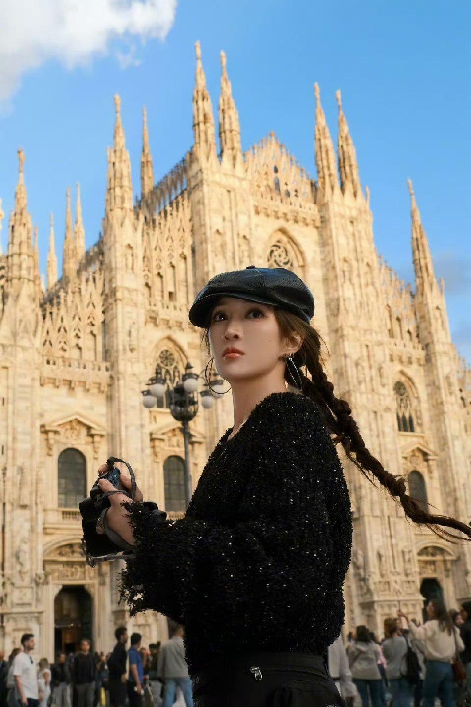 孟佳站在米兰大教堂前,光影交错间宛如电影女主角,每一帧都美得像壁纸,导演们快给姐姐递本子!