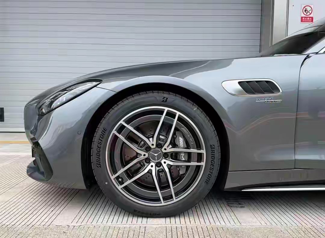 ● 车身侧面:长车头短车身跑车设计,前后侧翼子板宽体造型,前翼子板有鲨鱼鳃散热开口,车门配隐藏式把手。标配20英寸双5辐AMG轻合金轮毂和银色制动卡钳,也可选20英寸多辐AMG轻合金轮毂,选装AMG动态增强版组件后,还能选黑色或黄色制动卡钳。