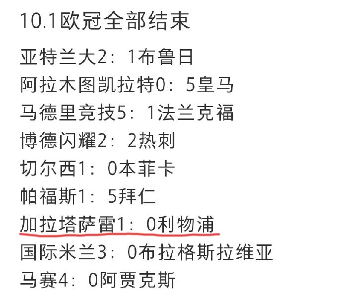 利物浦成10月1日欧冠比赛日唯一输球的强队,比分是0:1输给了加拉塔萨雷。整场比