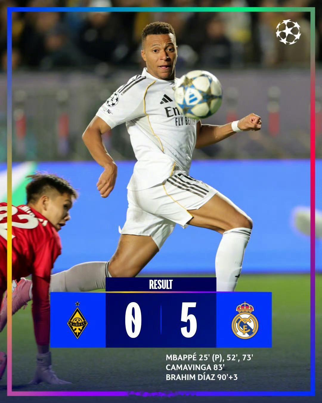 皇马5-0战胜阿拉木图凯拉特,取得欧冠两连胜!