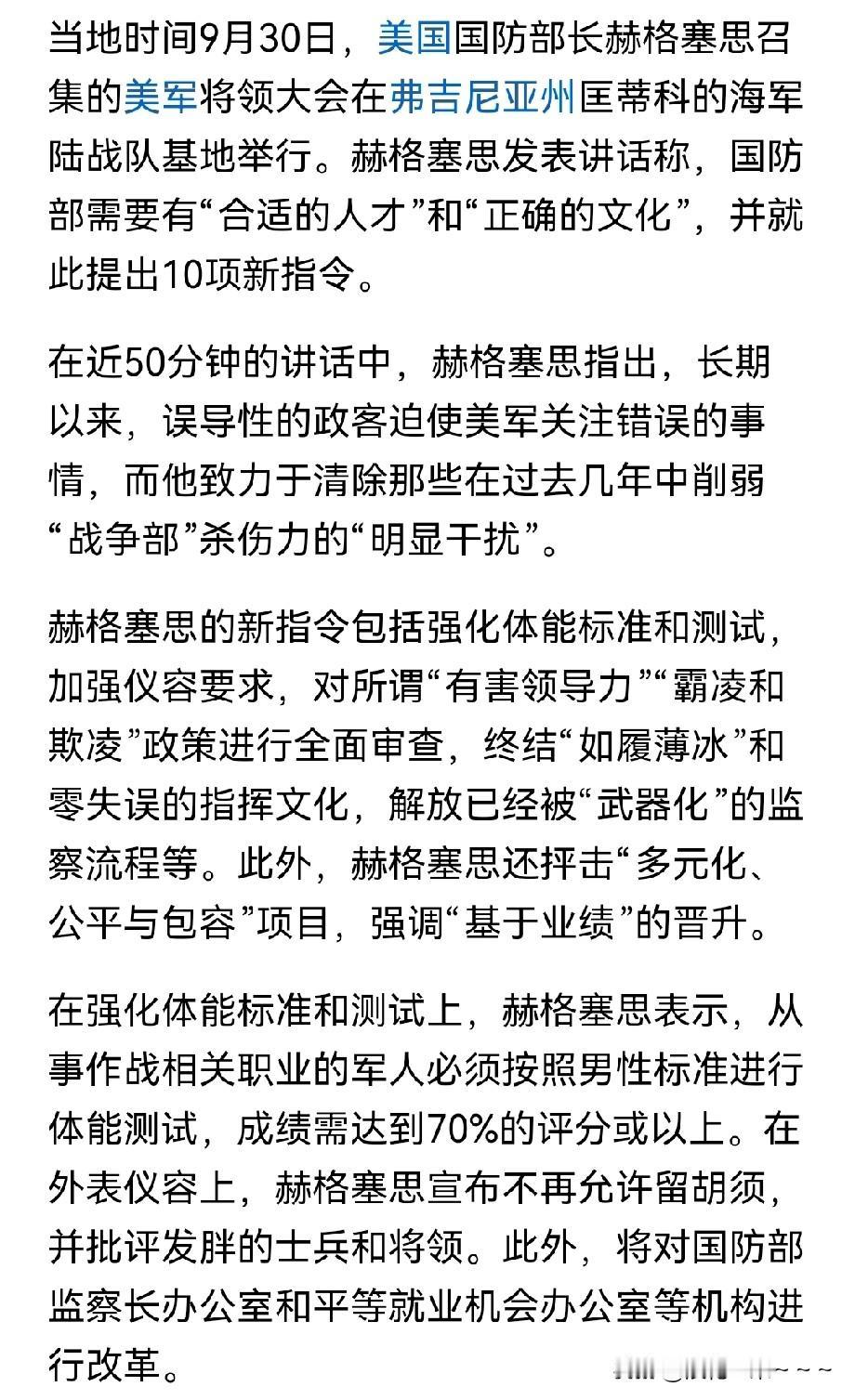 就在刚刚! 美军将领大会召开了! 所有将领都懵逼了,美防长的“训话”主要是10项新指令,强调要有“正确的文化”和“合适的人才”! 10项指令里,给人的第一感觉就是好多东西在向东方大国学习。 比如说军容风纪方面,不能留胡子,仪容仪表要整洁,要加强体能训练,要服从命令,听从他的指挥! 当然,很重要的一点就是要进行机构改革,减少美军高级将领的指标,批评“左翼民主党”是“绊脚石”,对不服从命令的人将进行“清洗”,以确保美防长和总统的权威。 总体来看,美防长这次大会就是一堂思想政治教育课!