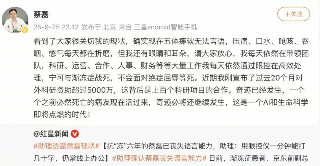 前几天,渐冻症icon人蔡磊发文,称虽然病痛一直折磨他,但呐喊“我还有眼睛和耳朵