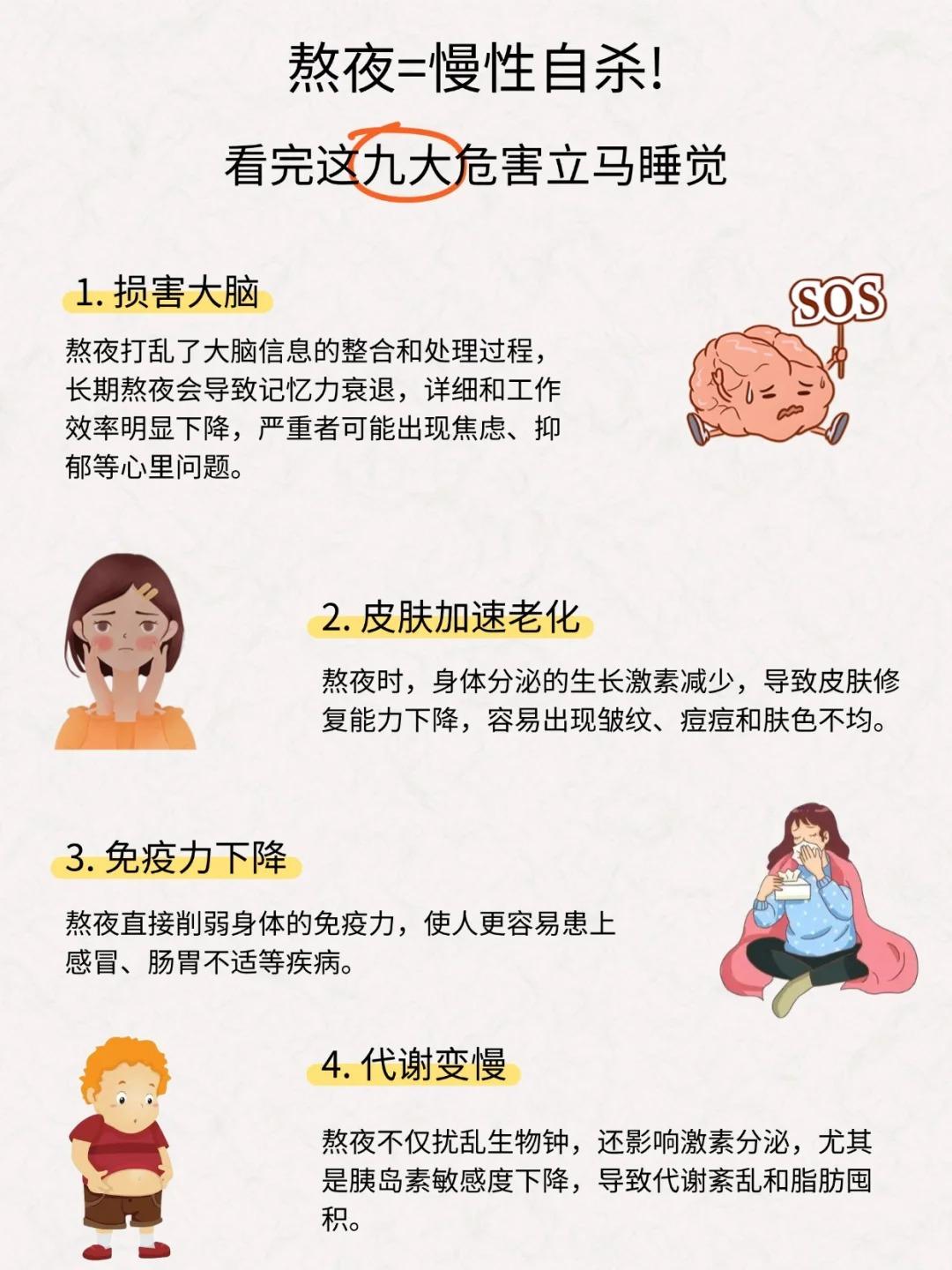 熬夜的九大危害! 1. 损害大脑 2. 加速皮肤老化 3. 免疫力下降 4. 代谢变慢 5. 心血管疾病风险增加 6. 伤肝 7. 毁眼 8. 脱发 9. 变笨