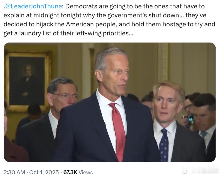 民左党人必须在今晚午夜向美国民众解释,为什么政府要关门……他们选择劫持美国人民,把他们当作人质,只为了逼迫通过一长串左派的优先事项清单。