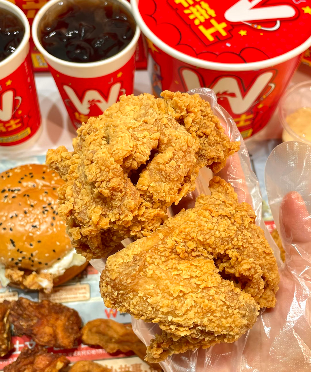 一打开桶盖,视觉冲击扑面而来:整整6块超大炸鸡堆叠如山,块头之大几乎要溢出桶外,每一块都比手掌还宽厚,光是看着就让人心潮澎湃。金黄酥脆的外皮在灯光下泛着诱人的光泽,轻轻一咬,“咔滋”一声清脆响亮,仿佛在嘴里点燃了一场微型烟花秀。这种极致的酥脆感,源自华莱士对工艺的严苛把控——双重裹粉、精准控温油炸,确保每一寸外皮都达到黄金酥脆标准。
