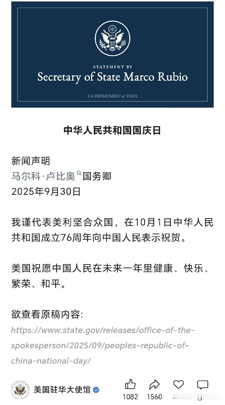 美国🇺🇸国务卿 卢比奥 发声明🇨🇳 祝福:中华人民共和国国庆日