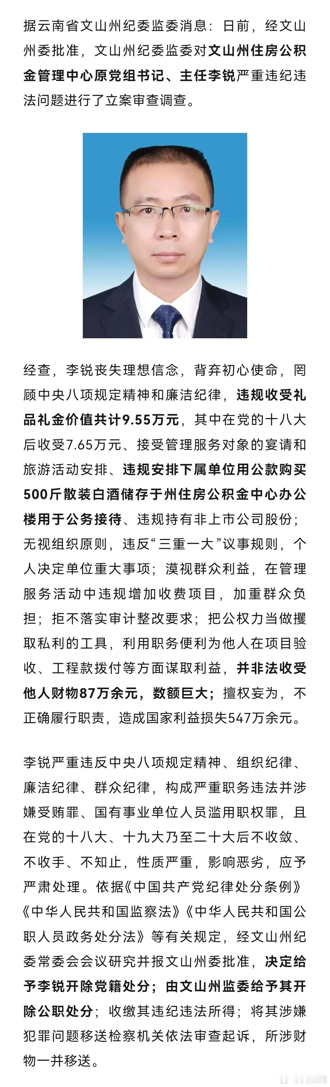 2025年9月29日,云南文山州纪委监委通报,州住房公积金管理中心原党组书记、主任李锐因严重违纪违法被“双开”。其违纪违法事实包括2013-2023年收受礼金礼品共9.55万元、2016年安排下属购买500斤散装白酒用于公务接待,还存在违规持股及非法收受财物87万余元等问题。