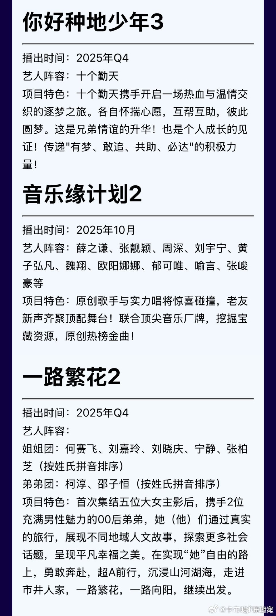 《一路繁花2》姐姐团:何赛飞、刘嘉玲、刘晓庆、宁静、张柏芝;弟弟团:柯淳、邵子恒