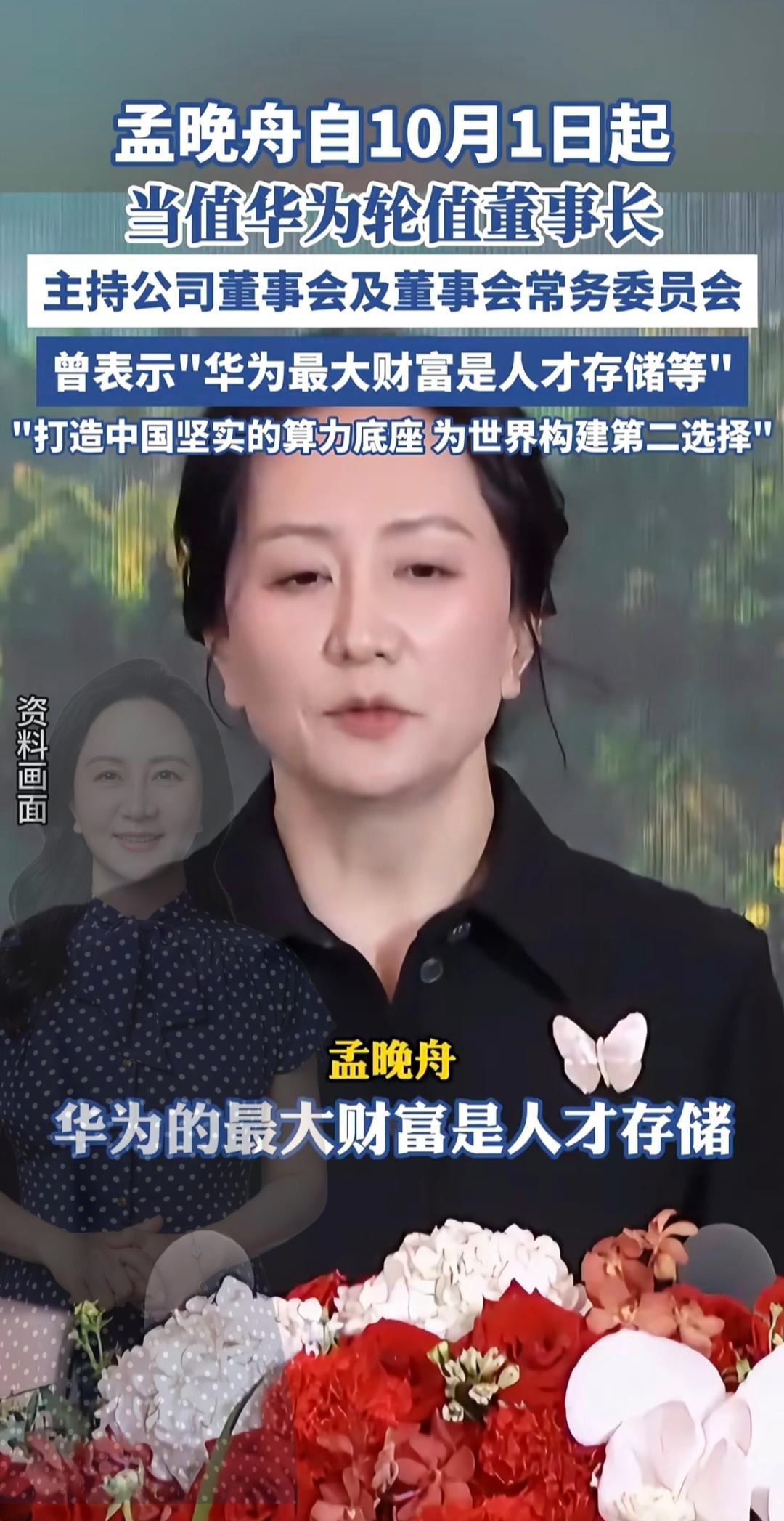 快讯! 华为正式宣布: 孟晚舟将在2025年10月1日接替徐直军出任华为董事长,任期半年。 华为一直以来采用轮值董事长制度,能够有效防止权力集中,确保董事长岗位能用在能干的人身上。 孟晚舟1993年入职华为,担任多职,贡献卓著,推动华为财务架构变革及管理变革,为华为的数字化、智能化转型探索出一条适合华为的路径。 孟晚舟的数字化风控能力将支持华为稳健发展。此时接任恰逢华为AI战略的关键时期。