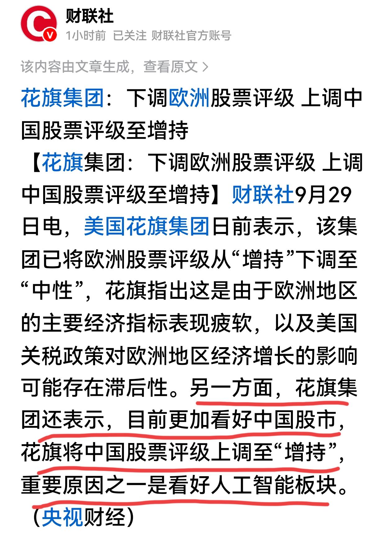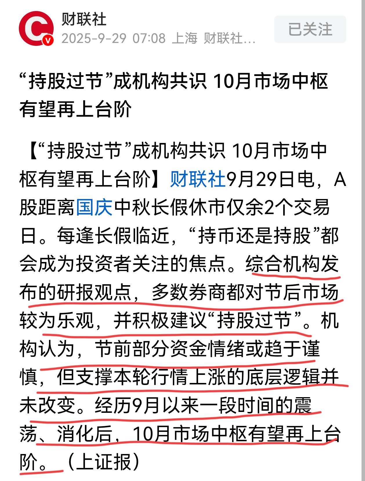 机构积极建议持股过节,高盛上调中国股票评级至增持,昨天三大股指全线上扬也印证了这一点。昨天市场情绪活跃,存储等热点亮眼,如果没有大金融压盘,破3900点都不会是问题,显示投资者不再纠结节后会否下跌,看好节后市场走势,觉得持股过节比踏空牛市要好。 每逢长假,投资人就会纠结于持股持币问题,这是A股多年现实教育的结果,原来的A股牛短熊长,尤其是近十年来就没有牛市,长期在3000点左右徘徊,没有趋势性的走势,市场易跌难涨,长假中稍有不利信息,节后股市就会下跌,所以处于风险控制考量,多数人选择持币过节比较安心。 这个国庆不一样了,A股处于从没有过的慢牛之中,向上趋势很明确,节后再上台阶是大概率事件,有什么理由不持股过节呢?机构看好股市、调高评级是有道理的,国家巩固资本市场回稳向好的势头,一揽子政策正在发酵,经济指标企稳转暖,科技突破给市场带来上涨动力,新“新三样”机器人、人工智能、创新药引领市场,开辟新的经济增长曲线。牛市正在途中,牛市中的心态自然不同,与牛市共舞方能分享牛市收益,持股是大多数人的选择。 祝大家国庆中秋快乐!愉快休假,节后收获!
