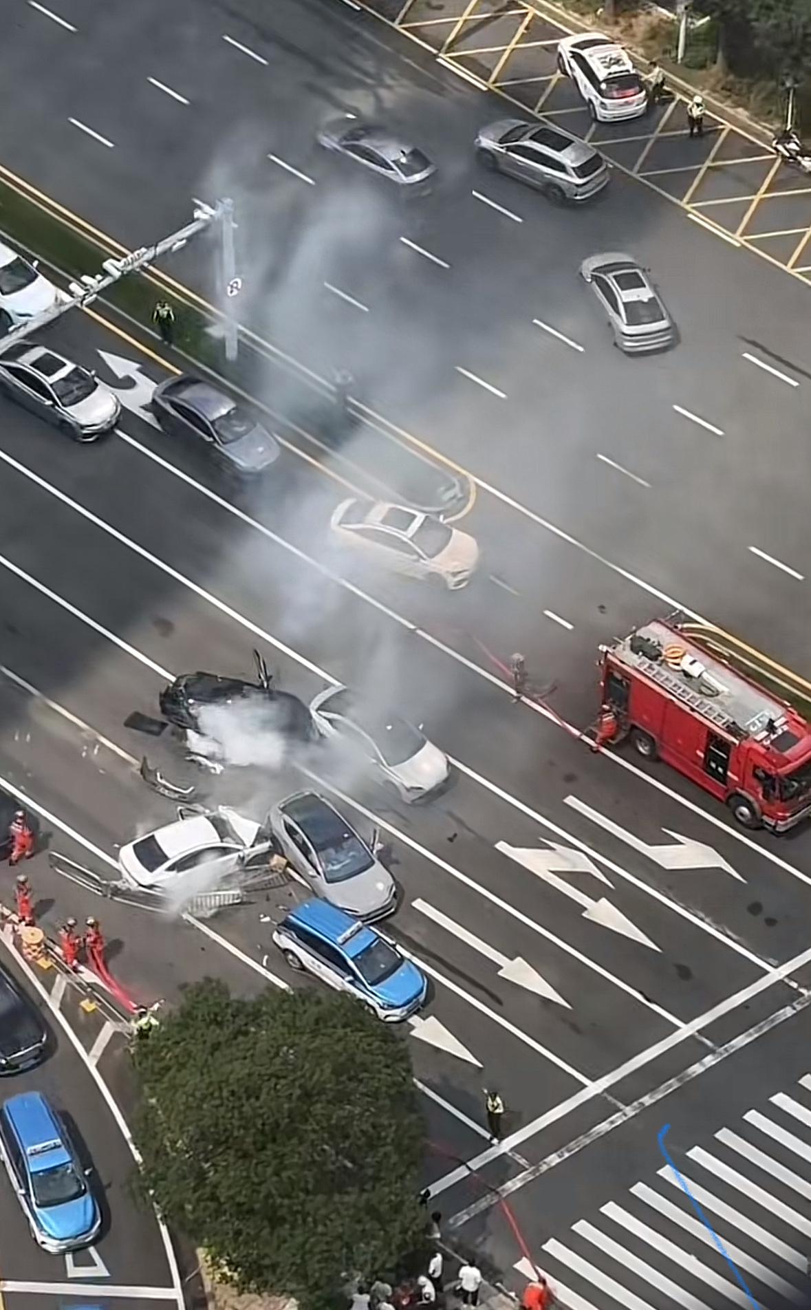 深圳北站发生交通事故好严重,从视频上看两台车都在冒烟,黑色车可能要着火,消防车已
