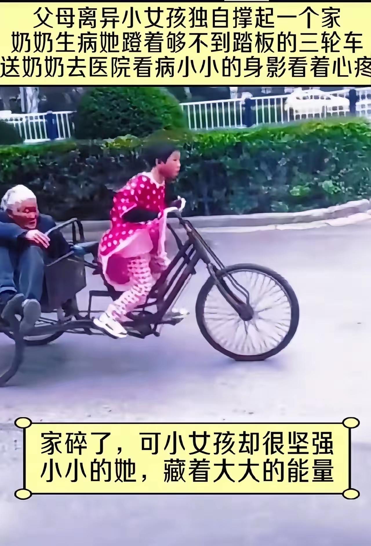 八九岁孩子的日常该是什么样?巷口追蝴蝶 ,怀里抱卡通抱枕,哭着闹着要甜筒。镜头里这姑娘不一样——正弓着小小的身子,跟一辆老旧三轮车“死磕”。 车斗铺着她攒半年的碎花布,奶奶裹在里面咳得发颤。她踮脚够踏板,腰弯成株被压弯的狗尾巴草,小手攥车把攥得发白,脸涨成红苹果,硬是让车轮挪出半米远。爸妈分开后,老院子就剩她和奶奶。前几天奶奶发烧卧床,她煮糊了粥,叠好奶奶的旧棉袄,今天揣着皱巴巴的零钱,要驮奶奶去卫生院。这身高刚过车斗的娃,怎么就成了家的顶梁柱? 她擦汗时眼里没半分怯,倒有股子不服输的韧。“屋漏偏逢连夜雨”,命运把难砸向她,却砸出了骨子里的硬气——不是不怕,是奶奶一声轻唤,就知道自己不能倒。 这张没滤镜的照片,看哭无数人。它照见有些孩子没待过温室,风一吹就学会自己挡雨。这姑娘的坚强从不是天生,是奶奶的咳嗽、糊掉的粥、难蹬的车教出来的。咱们别只心疼,递袋米,帮联系社区医生,别让这棵小树苗,独自扛风雨。八岁女孩 十几岁小女孩 小孩生活具象化