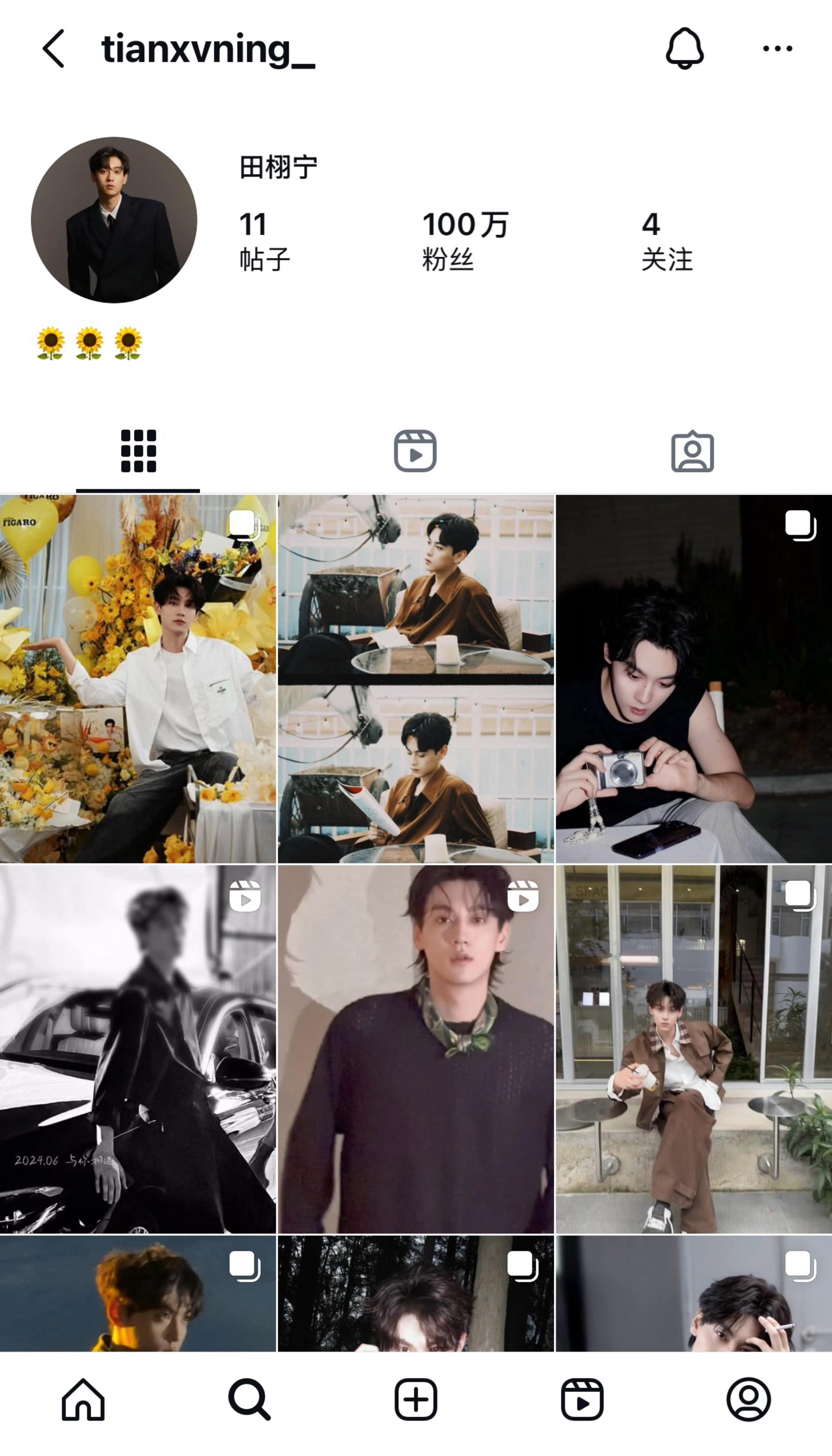 开通平台账号不到半年,仅发布11篇内容,田栩宁Ins 粉丝数已正式突破100万❗️