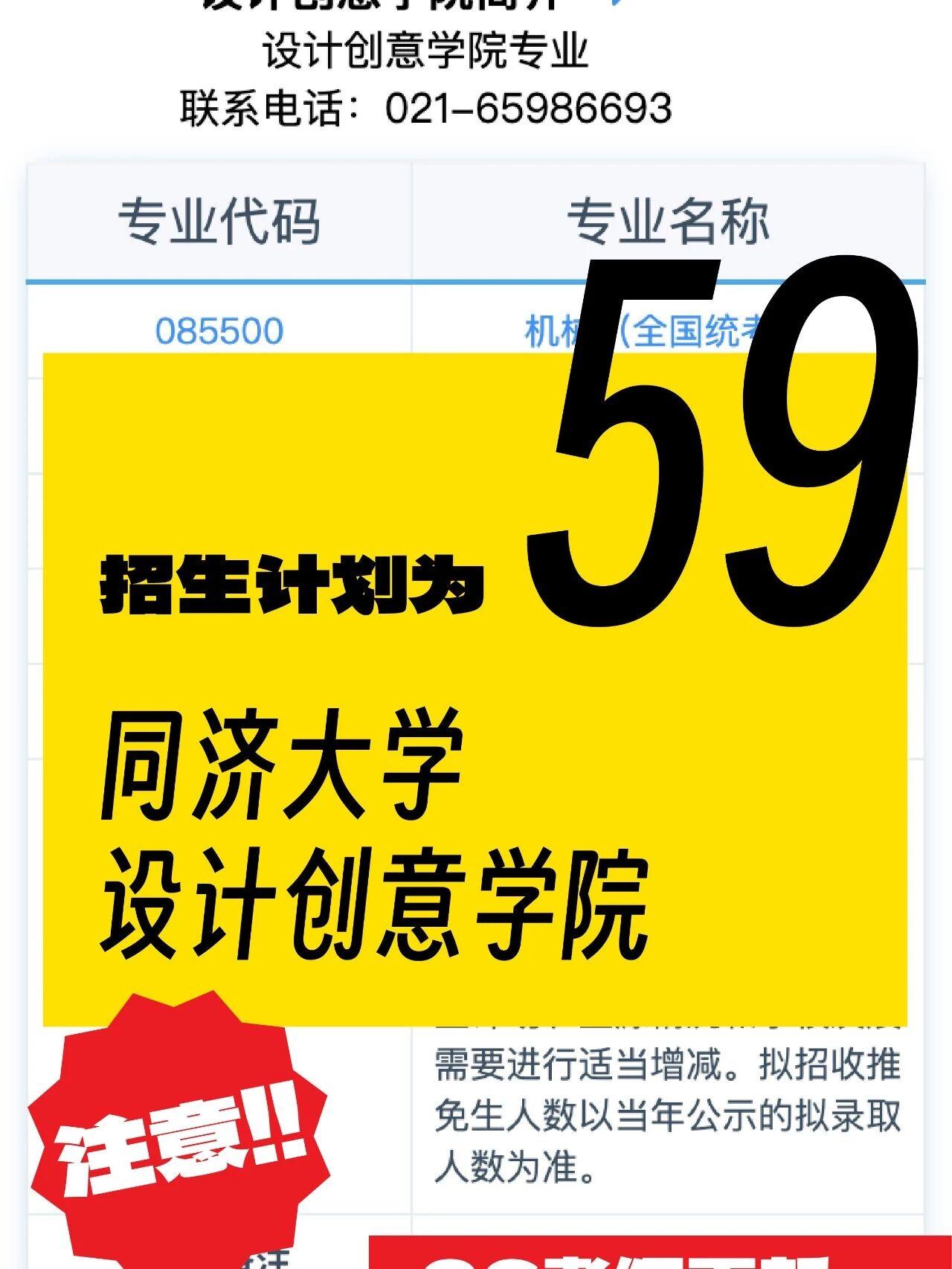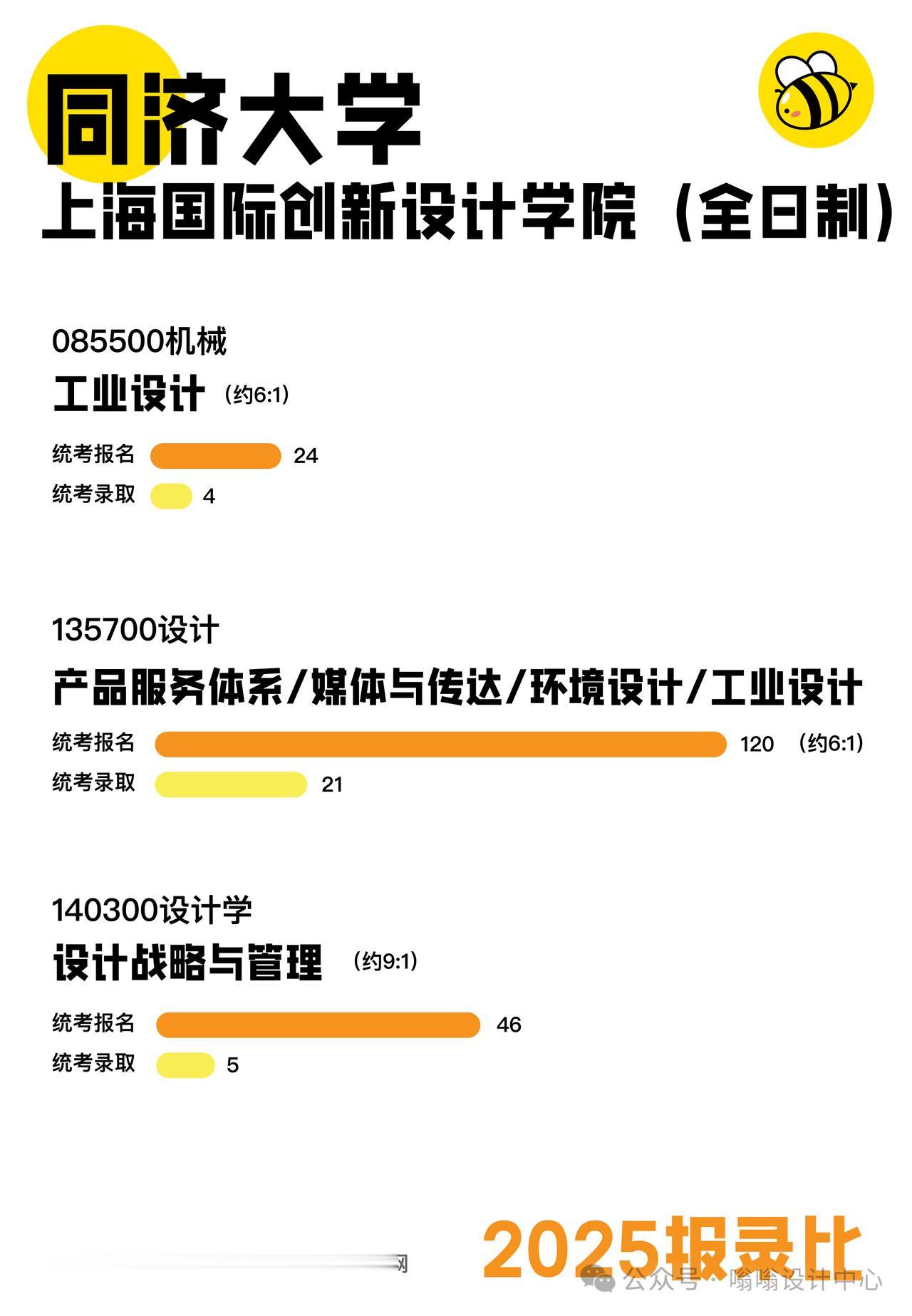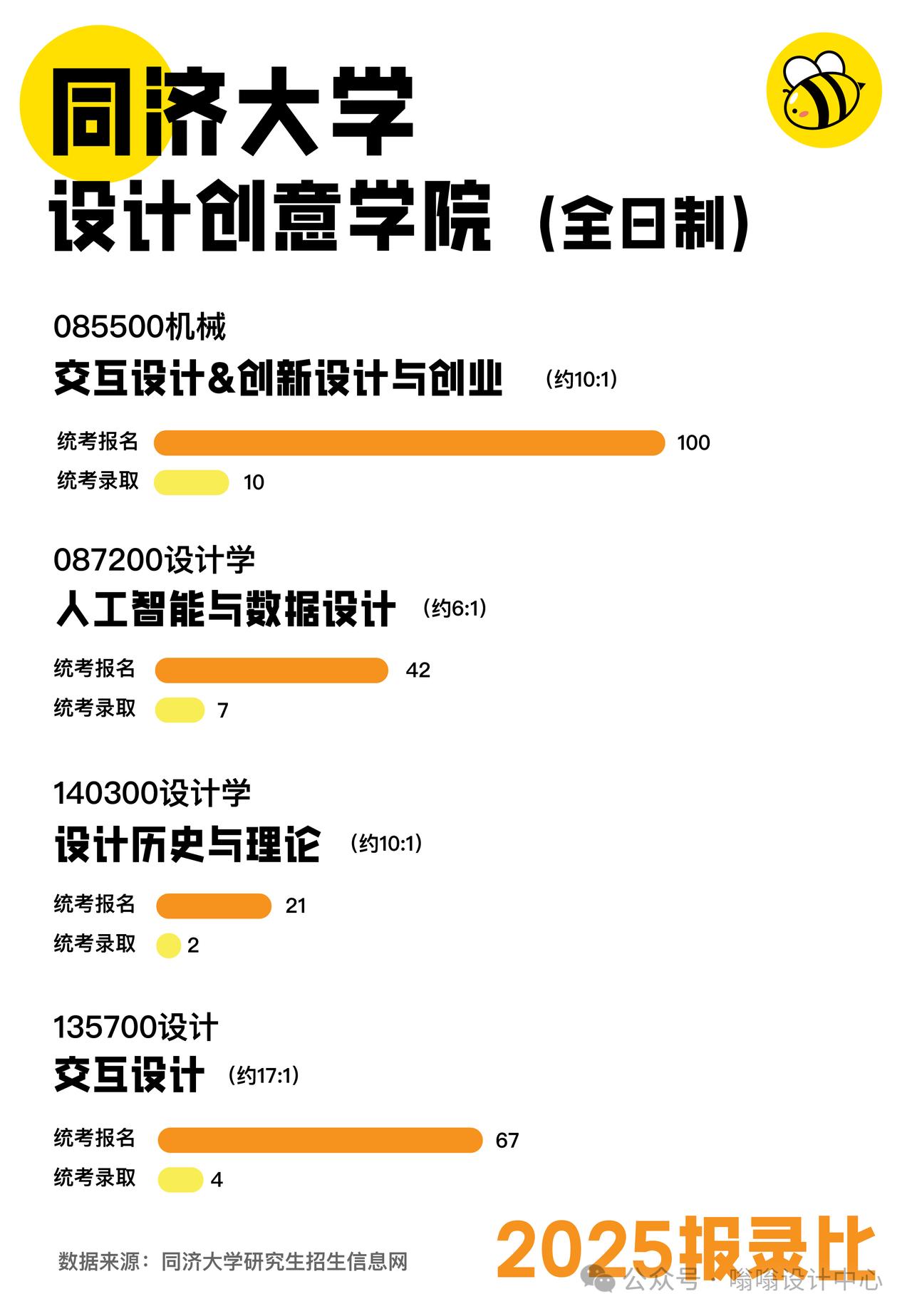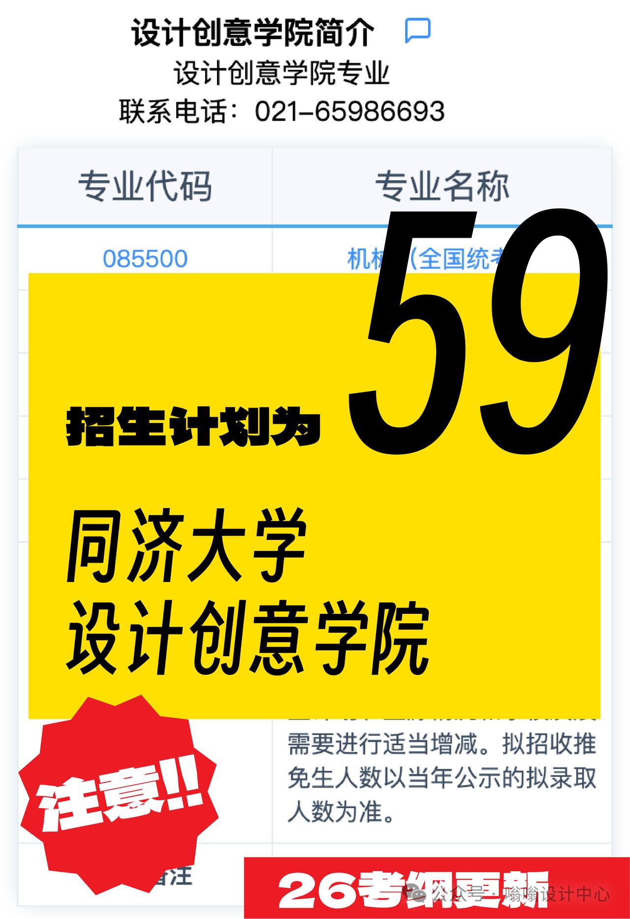 巨变!! 报录比低于10比1!同济26最新考纲及2025各专业报录比 * 数据来自同济大学研招网 🐝变化1:设创与国创合并为设计创意学院,国创没了! 🐝变化2:9个专业变化为8个专业,创新设计与创业、设计战略与管理合并为「设计战略、管理与创业」 🐝变化3:招生名额变多,预计总招收名额为:59人 (比25年招生更多,25年共招收53人) 🐝变化4:交互和工设(机械)可能划一个分数线,交互/工设/服务/战略/媒传/环境(设计)6大专业共划一个分数线 🔥更多问题,欢迎留言~我们将为你解答 喜榜!嗡嗡助力56位同学上同济!2025同济大学拟录取榜单来啦! 喜报丨霸榜同济!24嗡嗡助力56位同学上同济!包揽设创/国创/艺传/非全第一