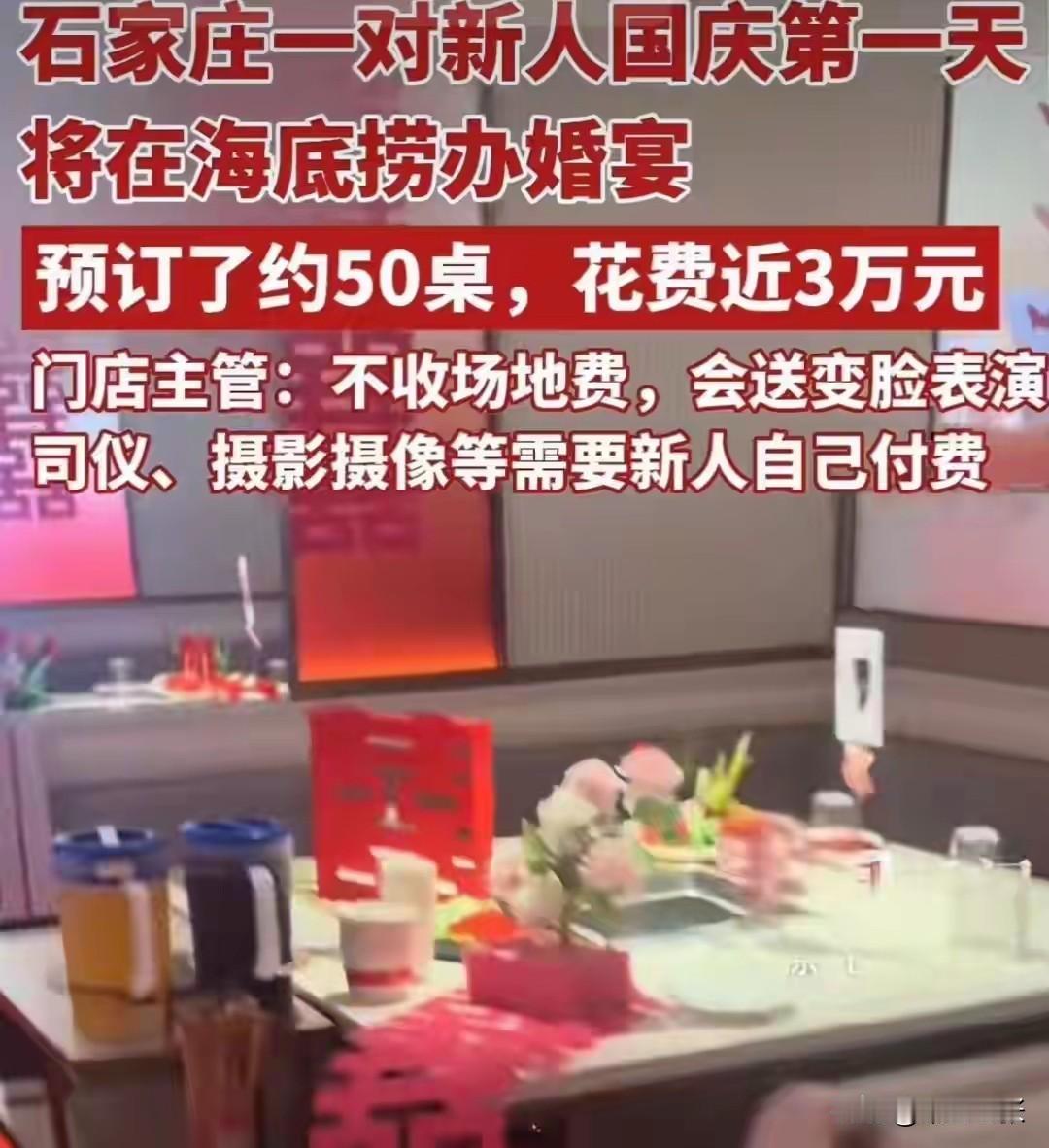 近日,网友称河北石家庄一海底捞门店10月1日11时至14时承办新人婚宴,该时段暂停接待普通顾客。9月30日,工作人员证实当日中午有婚宴,普通顾客14时30分左右可进店。 主管介绍,新人预订约50桌,提前点好锅底菜品,花费近3万,未透露人数。门店不收场地费,料碗、饮料正常收费,婚礼布置等由新人自理,店方协助并赠变脸表演。 客服称,海底捞无婚宴统一政策,可咨询当地门店或联系客服预订。国内多地海底捞曾承接婚宴,此前北京一男子办婚宴花4万多。 海底捞承接婚宴挺有意思。认可的网友认为,在知名连锁餐厅办婚宴有保障,服务和菜品质量让人放心。觉得不便宜的人,是对比了传统婚宴场地价格。其实海底捞不收场地费还赠表演,有一定吸引力。对新人来说,在海底捞办婚宴体验独特。此模式若推广,或成新潮流。