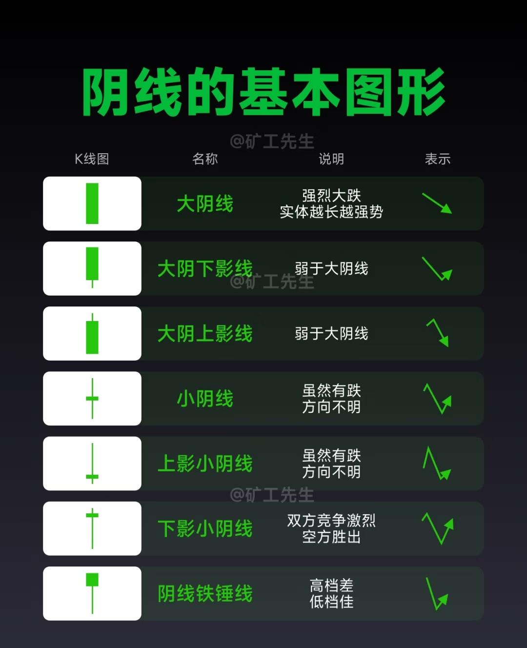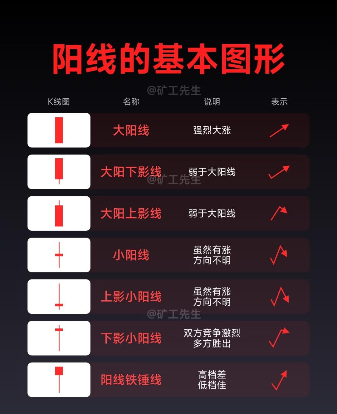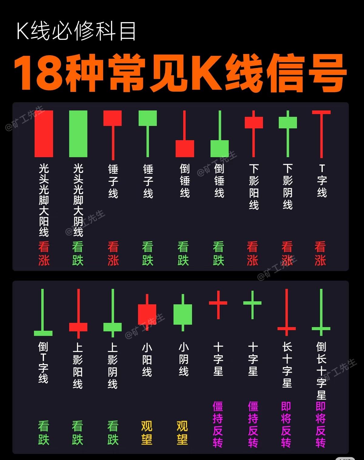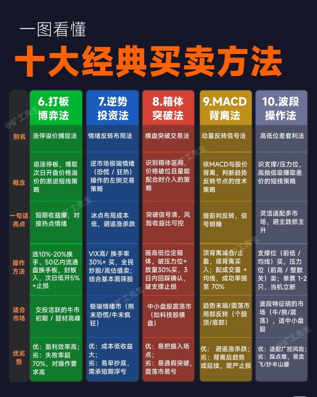 “十大经典买卖方法”,每张图展示其中五种,涵盖了股票、期货等市场中常见且经典的交易策略。 一、前五种经典买卖方法 1. 利弗莫尔买入法(倒金字塔加仓交易法) - 概念:分仓试错,控制风险,在股价突破关键位置时介入的趋势跟踪策略。 - 亮点:盈亏比高,抓住趋势爆发点。 - 操作:先小仓位(如20%)试探,突破后逐步加仓。 - 适合市场:单边趋势市(比如明显上涨或下跌行情)。 - 优劣势:优势是抓趋势强,劣势是趋势拐点容易误判,最好配合均线等工具。 2. 龙头战法 - 概念:聚焦市场热点中的领涨股(龙头股),追求短期高收益。 - 亮点:爆发力强,流动性好,适合题材热点行情。 - 操作:锁定核心标的,集中持仓,短期操作。 - 适合市场:题材活跃的震荡市或局部牛市(如AI、新能源等热门板块行情)。 - 优劣势:短期收益可能很高,但波动大,对选股能力要求高。 3. 海龟交易法 - 概念:基于趋势跟踪的系统化交易方法,注重规则与纪律。 - 亮点:适合高流动性品种,规则明确,纪律性强。 - 操作:在突破一定时间的高点后进场,有明确的进出场规则。 - 适合市场:高流动性趋势市场,如商品期货、大盘股。 - 优劣势:优势是避免主观判断,适合大趋势;劣势是在震荡市中容易频繁止损。 4. 价值投资法 - 概念:基于公司基本面,寻找被低估的优质资产,长期持有。 - 亮点:赚企业成长的钱,适合长期稳健投资者。 - 操作:分析财务报表与行业前景,低估值时建仓,持有3年以上,高估时卖出。 - 适合市场:估值低或合理的慢牛市,比如消费、医药等稳定行业。 - 优劣势:优势是长期复利,规避短期波动;劣势是短期内可能不涨甚至下跌,需耐心。 5. 均线交易法 - 概念:利用均线(如5日、20日、60日)的金叉与死叉作为买卖信号。 - 亮点:简单直观,适合抓中期趋势。 - 操作:5日线上穿20日为买入信号,下穿为卖出信号,可结合成交量和更大周期均线(如60日)过滤信号。 - 适合市场:有明显趋势的市场。 - 优劣势:优势是简单易懂,适合新手;劣势是信号有时滞后,在震荡市中容易产生误判。 二、后五种经典买卖方法 6. 打板博弈法(涨停溢价捕捉法) - 概念:追击涨停板,博弈次日开盘溢价收益的激进短线策略。 - 亮点:短线爆发力极强,适合激进投资者。 - 操作:选择换手率适中(如10%左右)、流通盘较小(50亿以内)的涨停板,封板时买入,次日低开则止损。 - 适合市场:市场情绪高涨、连板行情多的阶段。 - 优劣势:高风险高收益,需严格止损,适合短线高手。 7. 逆势投资法(情绪反转布局法) - 概念:在市场极度恐慌或狂热时反向操作,属于左侧交易。 - 亮点:抓市场情绪反转点,搏取大波动收益。 - 操作:在市场情绪极度低迷(如高VIX、高换手率、全民炒股或高估值)时考虑买入,情绪狂热时卖出。 - 适合市场:极端情绪化的市场,比如恐慌性杀跌或非理性暴涨阶段。 - 优劣势:优势是逆向思维可能抓住大底或顶部;劣势是对心理素质和判断要求极高。 8. 箱体突破法(横盘突破交易法) - 概念:在价格长时间横盘整理后,突破箱体上沿且伴随量能放大时介入。 - 亮点:信号明确,风险收益比相对可控。 - 操作:识别横盘区间,等待价格突破并放量时进场,配合支撑/压力位管理。 - 适合市场:震荡行情中即将变盘的市场,适合中小盘股。 - 优劣势:优势是突破后空间可能较大;劣势是假突破较多,需量能配合。 9. MACD背离法(动量反转信号法) - 概念:利用MACD指标与价格之间的背离关系,判断趋势衰竭与反转。 - 亮点:动量指标辅助判断顶底,提高成功率。 - 操作:价格创新高但MACD走低为顶背离(考虑减仓/止盈),价格创新低但MACD走高为底背离(考虑买入),可结合成交量和均线使用。 - 适合市场:趋势行情末期或反转阶段,适用于各类市场。 - 优劣势:优势是能提前预警反转;劣势是需要结合其他指标过滤假信号。 10. 波段操作法(高低位差套利法) - 概念:在价格相对低位(支撑位/前低/均线附近)买入,在高位(压力位/前高/整数关口)卖出,赚取中间差价。 - 亮点:灵活适配多种市场环境,适合多数股票类型。 - 操作:支撑位(如前低/均线)买入,压力位(如前高/整数关)卖出,结合成交量与均线提升胜率。 - 适合市场:适用于震荡市、牛市、熊市中的波段行情,适合大盘股与中小盘股。 - 优劣势:优势是能适应多种市场,避开主跌浪,抓住主升浪;劣势是需要精准判断高低点。 总结 这十大交易方法涵盖了从长线价值投资到超短打板博弈,从趋势跟踪到震荡波段,从基本面分析到技术指标应用的各个方面,适合不同风格、不同市场阶段的投资者。