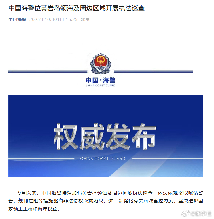 【#中国海警位黄岩岛领海及周边区域开展执法巡查#】9月以来,中国海警持续加强黄岩岛领海及周边区域执法巡查,依法依规采取喊话警告、规制拦阻等措施驱离非法侵权滋扰船只,进一步强化有关海域管控力度,坚决维护国家领土主权和海洋权益。(中国海警微信公众号)
