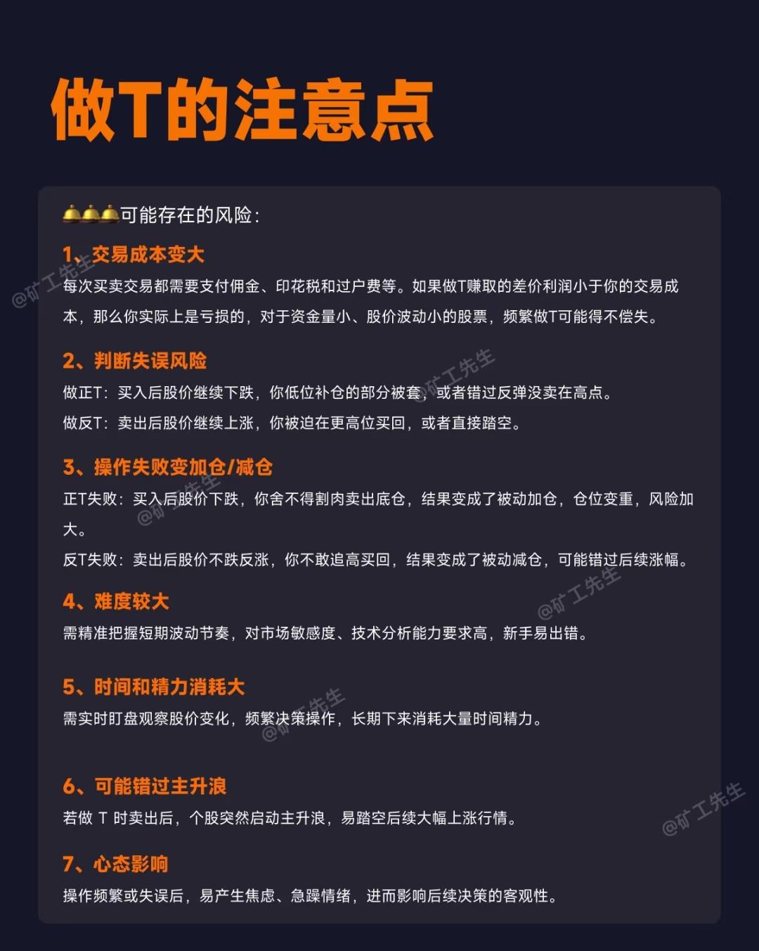 为什么要做T “做T”是指在同一个交易日内完成一次买入和一次卖出的操作,即当天“一进一出”的闭环交易。它源自A股“T+1”交易规则(当天买入的股票只能次日卖出),投资者利用已有的持仓,通过在当天先买后卖(正T)或先卖后买(反T)的方式,实现类似“T+0”的日内买卖,从而赚取股价波动带来的差价,目的是“多赚钱”或“多省钱”。 “做T”分为两种主要方式: 1. 正T(低买高卖):先买入、后卖出。投资者先持有底仓,当股价下跌到支撑位时加仓买入,待股价反弹到压力位时卖出新增的仓位,从而赚取差价。这种方式适合震荡上涨或底部横盘的行情。 2. 反T(高卖低买):先卖出、后买入。投资者先持有底仓,当股价冲高时先卖出部分仓位,等股价回落时再买回同等数量,实现高卖低买赚差价。这种方式适用于震荡下跌或顶部滞涨的行情。 做T的主要目的和好处包括: - 突破T+1限制,实现日内灵活交易,达到类似T+0的效果; - 在震荡行情中挖掘小幅波动带来的盈利机会; - 降低持仓成本,尤其是在套牢时通过反复操作减轻成本压力; - 提高资金使用效率,让资金在波动中不断滚动,实现复利增长; - 增强主动应对市场波动的能力,更加积极地管理投资。 然而,做T也存在一定风险和难点,主要包括: 1. 交易成本较高,频繁买卖产生的佣金、印花税等可能侵蚀利润; 2. 判断失误风险大,可能买入后继续跌或卖出后继续涨; 3. 操作失败可能导致被动加仓或减仓,影响原计划; 4. 需要精准把握短期股价波动,对技术分析和市场敏感度要求高,新手容易出错; 5. 需要频繁盯盘和操作,耗时耗力; 6. 可能因为做T卖出后错失个股随后的主升浪行情; 7. 操作中一旦失误容易引发焦虑、急躁等负面情绪,影响后续投资决策。 总的来说,做T是一种利用日内波动进行主动交易、降低成本或赚取短期收益的投资技巧,适合有一定经验、能够把握市场短期波动的投资者,但对于新手或没有足够时间盯盘的人来说,存在一定挑战与风险。