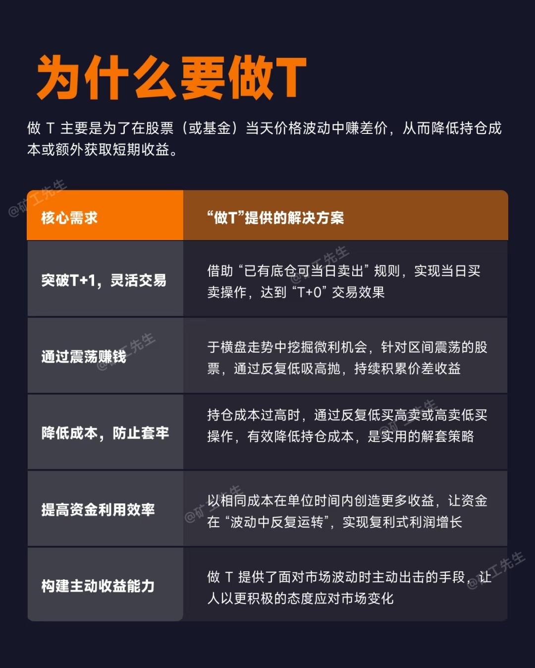 为什么要做T “做T”是指在同一个交易日内完成一次买入和一次卖出的操作,即当天
