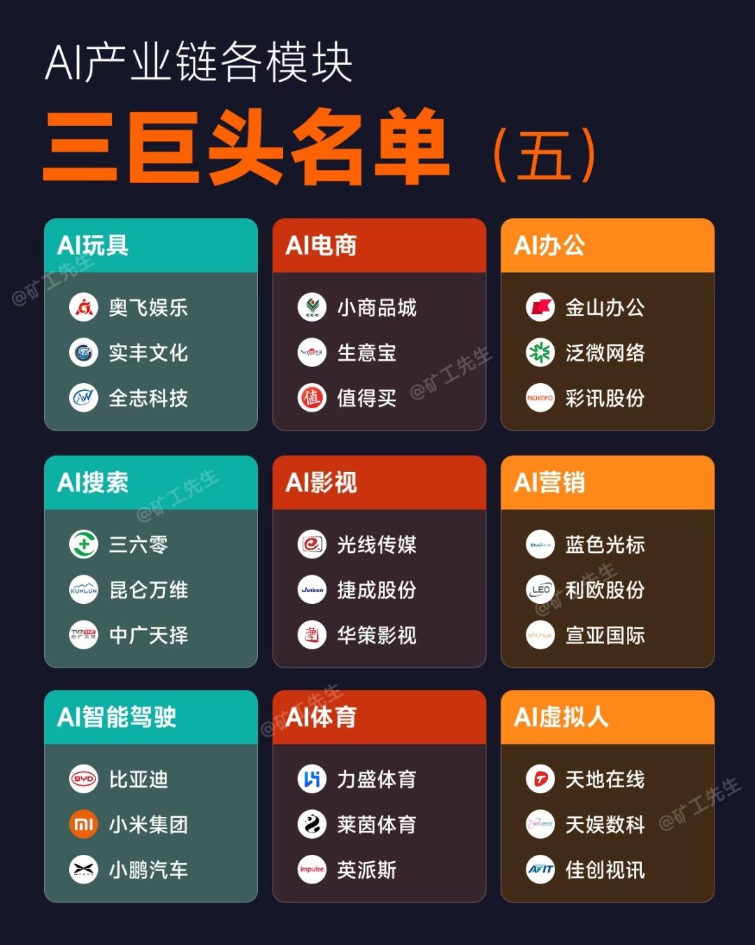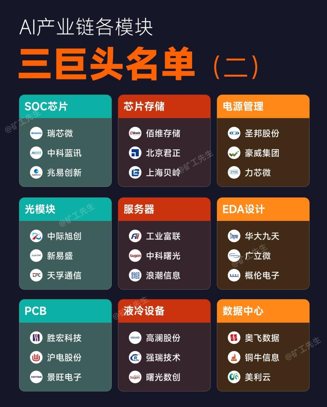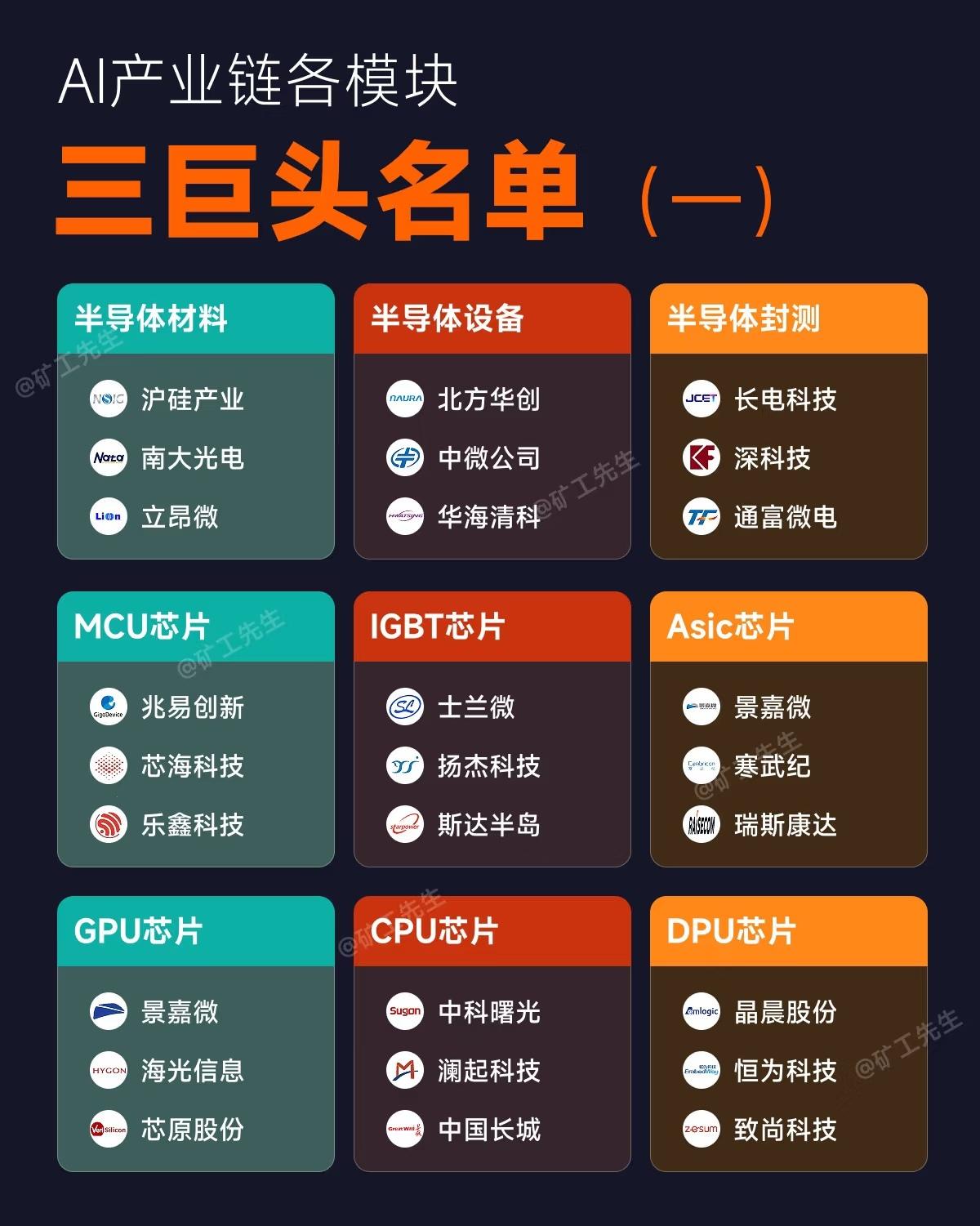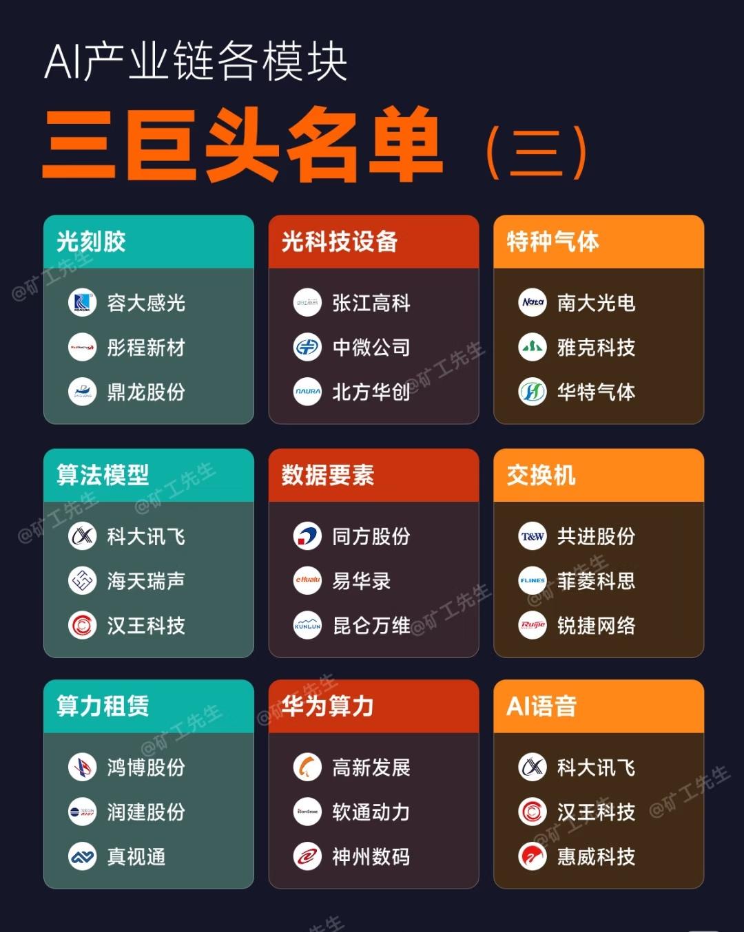 人工智能(AI)产业链各关键模块的“三巨头”代表性企业,覆盖从上游基础硬件与材料、中游核心芯片与算力支撑,到下游多场景应用的全链条,具体内容按模块分类总结如下: 一、基础硬件与材料(上游) - 半导体材料:沪硅产业、南大光电、立昂微(覆盖如NAND等关键材料) - 半导体设备:北方华创、中微公司、华海清科(核心制造设备供应商) - 半导体封测:长电科技、通富微电、深科技/JCET(封装测试环节主力) - 特种气体/光刻胶/光科技设备(第三张图补充): - 特种气体:南大光电、雅克科技、华特气体; - 光刻胶:容大感光、彤程新材、鼎龙股份; - 光科技设备:张江高科、中微公司、北方华创(部分与半导体设备重叠,强调光刻等关键工艺设备)。 二、核心芯片(中游关键组件) - 通用/专用芯片: - MCU芯片:兆易创新、芯海科技、乐鑫科技(微控制单元); - IGBT芯片:士兰微、扬杰科技、斯达半岛(功率半导体); - ASIC芯片:景嘉微、寒武纪、瑞斯康达(定制化专用芯片); - GPU芯片:景嘉微、海光信息、芯原股份(图形处理与AI加速); - CPU芯片:中科曙光、澜起科技、中国长城(中央处理器); - DPU芯片:晶晨股份、恒为科技、致尚科技(数据处理单元)。 - 其他芯片模块(第二张图补充): - SOC芯片:瑞芯微、中科蓝讯、兆易创新(系统级芯片); - 芯片存储:佰维存储、北京君正、上海贝岭(存储解决方案); - 电源管理:圣邦股份、豪威集团、力芯微(电源管理芯片)。 三、设计与配套服务(中游支撑) - EDA设计(第二张图):华大九天、广立微、概伦电子(芯片设计软件工具); - PCB(第二张图):青绿色背景企业(印刷电路板,未列具体三巨头但属关键环节); - 液冷设备(第二张图):高澜股份、强瑞技术、曙光数创(散热解决方案)。 四、算力与数据基础设施(中游核心支撑) - 服务器:工业富联、中科曙光、浪潮信息(计算设备载体); - 光模块(第三张图):中际旭创、新易盛、天孚通信(高速数据传输核心); - 数据中心(第二张图):奥飞数据、铜牛信息、美利云(算力存储中心); - 算力租赁/华为算力(第三张图): - 算力租赁:鸿博股份、润建股份、真视通; - 华为算力:高新发展、软通动力、神州数码(与华为生态相关的算力服务); - 算法模型/数据要素/交换机(第三张图): - 算法模型:科大讯飞、海天瑞声、汉王科技(AI算法与数据训练); - 数据要素:同方股份、易华录、昆仑万维(数据资源与处理); - 交换机:共进股份、菲菱科思、锐捷网络(网络通信基础设备)。 五、下游应用场景(终端落地) - 视觉与安防(第四张图):AI图像:海康威视、大华股份、英飞拓(监控与图像识别); - 互动娱乐:AI游戏:巨人网络、汤姆猫、三七互娱(游戏领域AI应用); - 金融服务:AI金融:同花顺、恒生电子、拓尔思(金融智能服务); - 智能交互:AI智能体:汉得信息、金财互联、视觉中国(智能助手与数字内容); - 健康医疗:AI医疗:卫宁健康、万达信息、贝瑞基因(医疗AI应用); - 教育领域:AI教育:竞业达、豆神教育、科德教育(教育智能化); - 智能硬件: - AI手机:中兴通讯、水晶光电、福蓉科技(手机端AI集成); - AI眼镜:长盈精密、亿道信息、国光电器(穿戴设备AI化)。 - 新兴应用场景(第五张图): - AI玩具:奥飞娱乐、实丰文化、全志科技; - AI电商:小商品城、生意宝、值得买; - AI办公:金山办公、泛微网络、彩讯股份; - AI搜索:三六零、昆仑万维、中广天择; - AI影视:光线传媒、捷成股份、华策影视; - AI营销:蓝色光标、利欧股份、宣亚国际; - AI智能驾驶:比亚迪、小米集团、小鹏汽车; - AI体育:力盛体育、莱茵体育、英派斯; - AI虚拟人:天地在线、天娱数科、佳创视讯。 综上,这五张图片从“基础材料与设备→核心芯片→设计服务→算力支撑→终端应用”的完整链条,系统呈现了当前中国AI产业链各环节的头部企业代表,覆盖了技术攻坚、生产制造、应用落地的全流程关键节点。