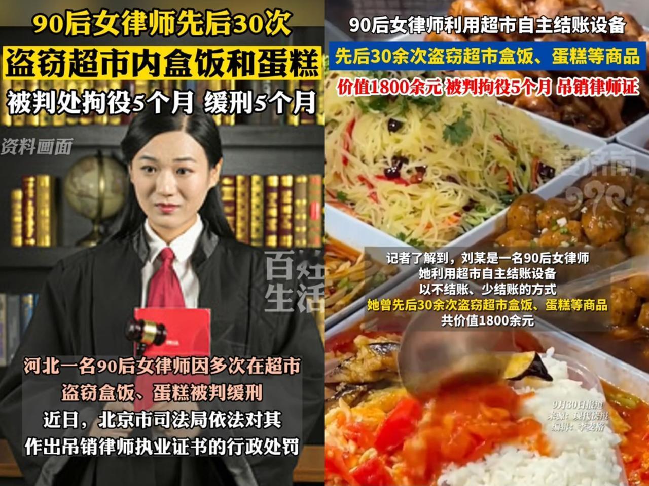 “知法犯法,罪加一等”, 这话可一点不假! 北京有个90后女律师,竟为了 贪点小便宜,在超市自助结账机那耍起了小聪明她前前后后30多次偷拿盒饭、蛋糕,加起来也就1800多块钱。可结果呢,不仅闹上了法庭, 连律师执照都被吊销,这下可真是赔得底儿掉!这刘某天天在律所跟法律打交道,按说最清楚后果,却偏揣着明白装糊涂。趁没人盯着自助机, 就少扫、不扫商品,自以为聪明,结果超市监控看得明明白白。被抓时她才慌了神,赶紧赔钱求谅解,哪有那么容易? 法院判她拘役5个月缓刑5个月,还罚3000块司法局直接吊销执业证,以后想干法律相关工作都没门了。您说,她这是咋想的呢? 是纯粹的侥幸心理,还是压根没拎清轻重?大家一起来聊聊。