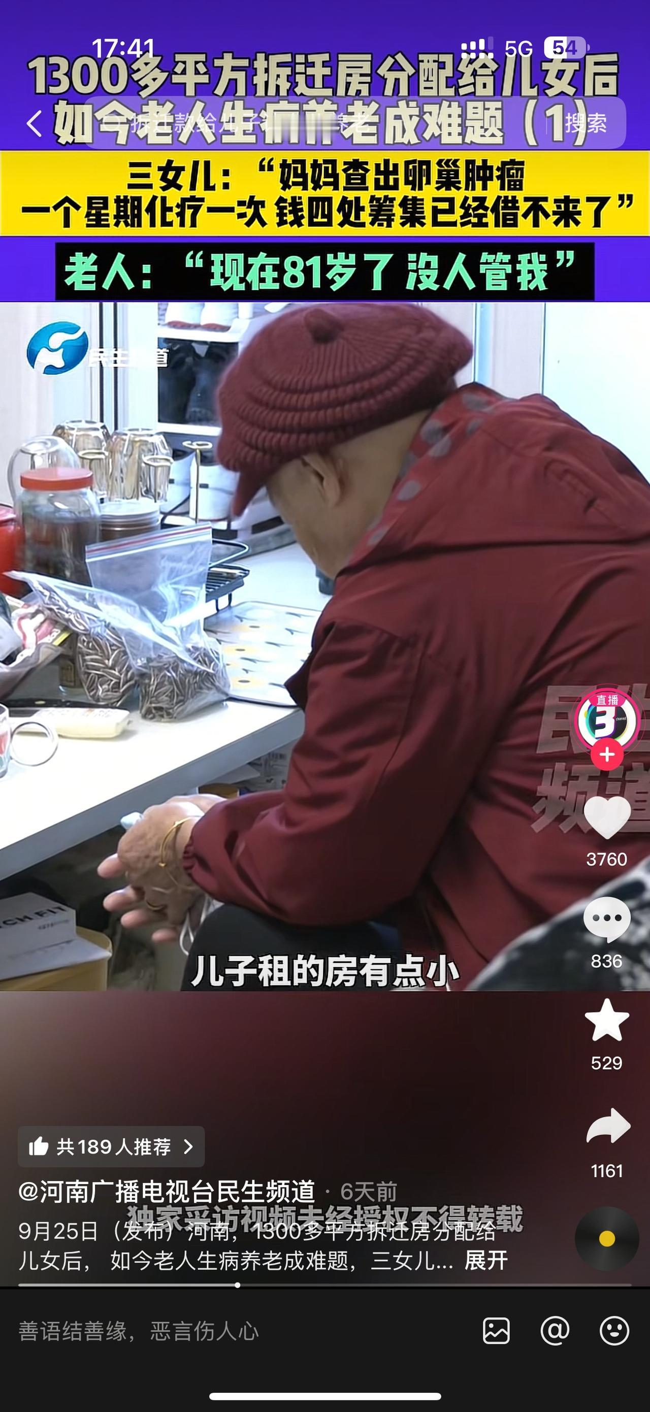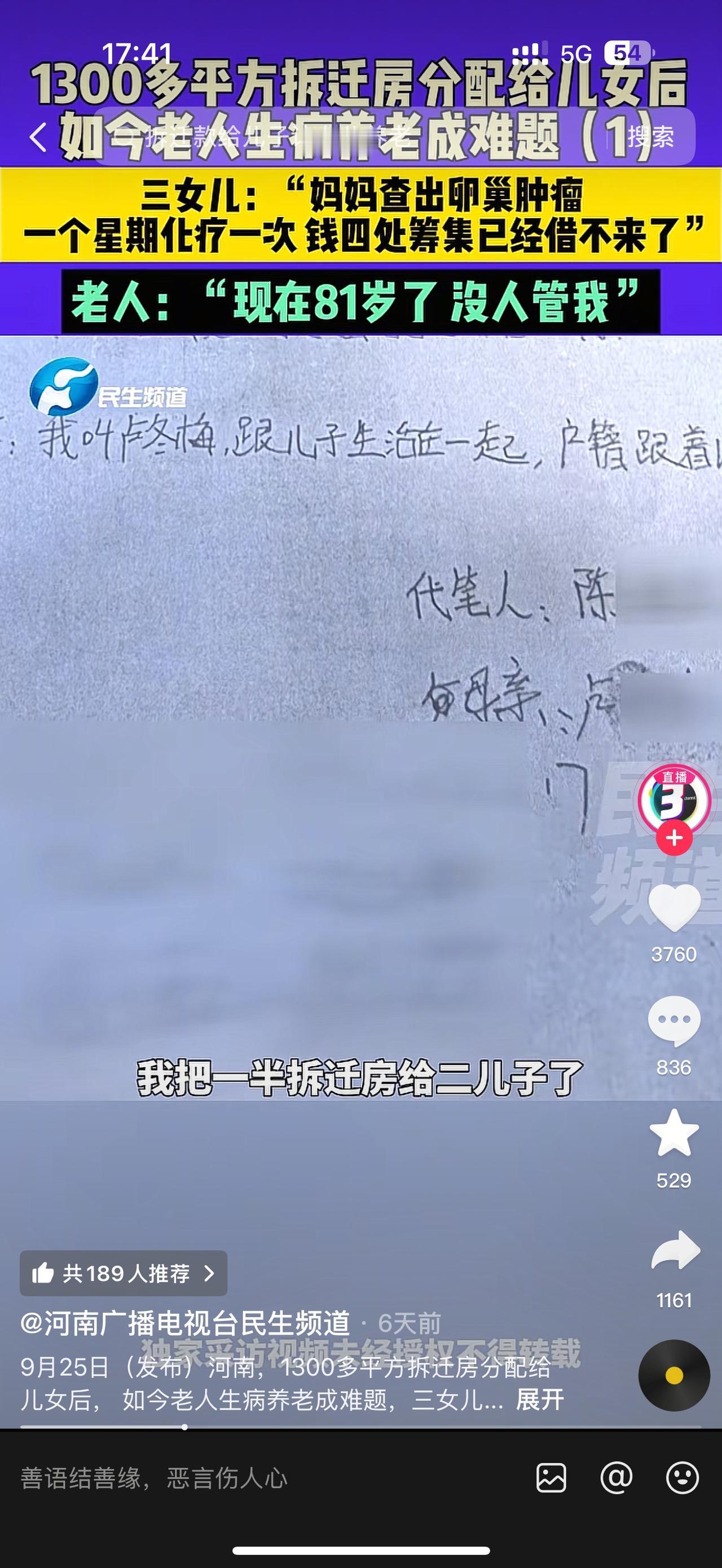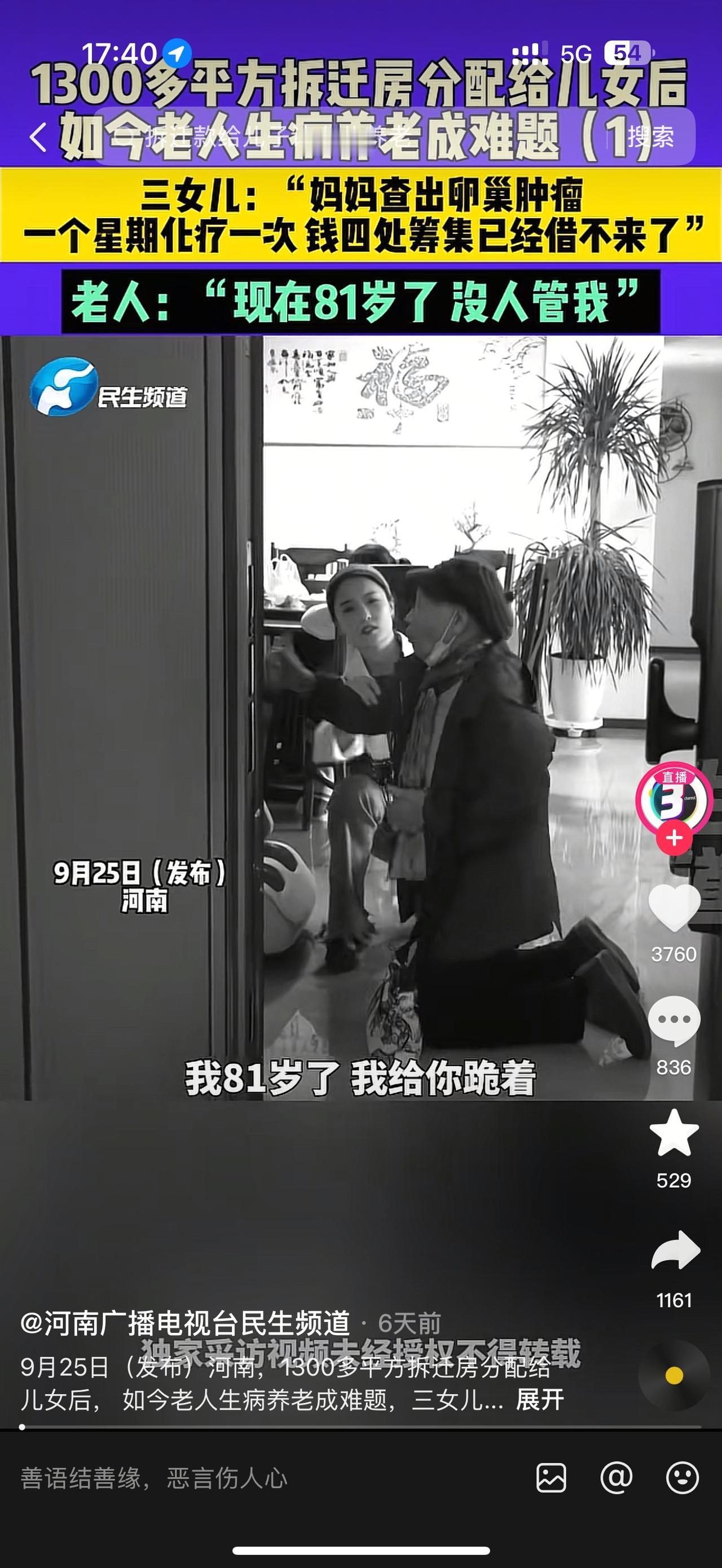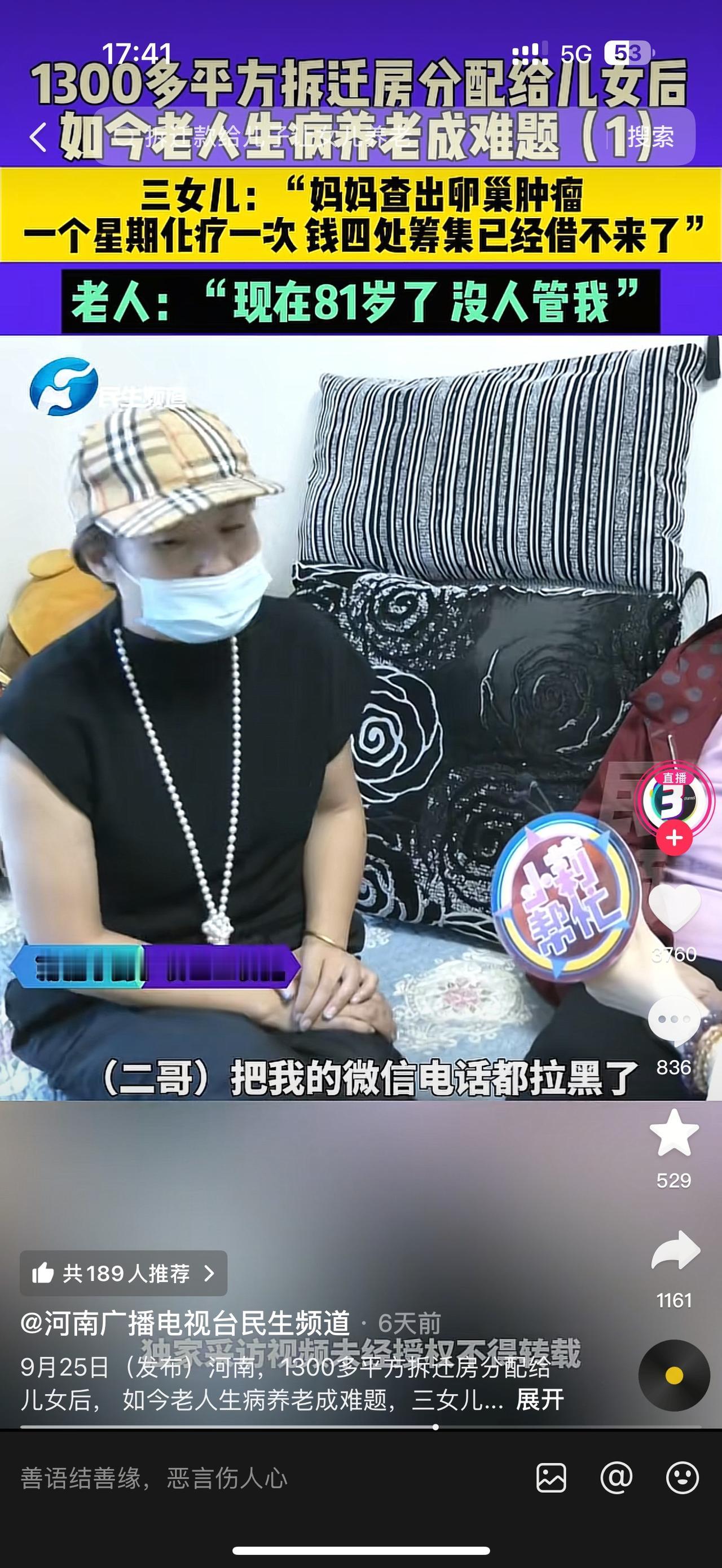 “禽兽都不如!”河南,一老奶奶靠祖上老宅,拆迁分得1300平米房子,市场价1000万左右,奶奶一高兴给了儿子,自己啥都没得,万万没想到,儿子心黑了,十多年根本不履行做儿子的赡养责任,无奈只好跟着小女儿生活,不巧是奶奶又查出大病,儿子一毛不拔,走头无路下,求助媒体,奶奶只有一个夙愿,最后也只能这么办。 2014年拆迁时,卢女士的地皮成了香饽饽。大女儿出了钱盖房,当初承诺“盖成了有你一半,我自己一半”,拆迁后卢女士便兑现承诺,给了大女儿一半的拆迁房。 剩下的一半在她名下,她又全给了没出一分钱的二儿子。三闺女呢? 老人只给了150平方米,还是在记者追问下才勉强提起。 “那纸上写的是和儿子一块生活,你现在咋跟着三闺女啊?”记者指着当年的赡养协议问。 卢女士叹了口气:“当时房子没回迁,儿子租的房小,孙女的姥姥在那住,我再去就挤不下了。后来房子回迁了,他也不管不问,我就一直跟着三闺女了。” 这一住就是十几年。三闺女李娟(化名)苦笑着点头:“从2018年妈摔断腿后,就基本在我这住了。”2023年,卢女士被查出卵巢肿瘤,一个星期要化疗一次,一个月下来光医药费就压得人喘不过气。 李娟四处借钱,头发都愁白了,可二哥李军(化名)却把她的微信拉黑了,母亲打电话也从不接,只有视频为证,记录下一次次无人接听的忙音。 记者在民事调解书上看到,李军自2023年1月起至2025年5月,需每月支付赡养费600元,共计3000元。 可卢女士抹着眼泪说:“一分钱没得到。” 为了弄清情况,记者跟着李娟找到了李军家。 开门的是李军的媳妇王兰(化名),她一脸不耐烦:“他经常跑大车出去了,很少回来。” 当被问及赡养费,王兰立刻诉起苦来:“欠人家一屁股债!五百多平的房子就剩这一套,装修钱还是借的。” 卢女士忍不住反驳:“欠钱你们还在海南买房?”王兰梗着脖子回:“海南的房是我娘家妈出的钱!” 王兰表示家里还有大学生要养,实在没钱,但愿意每月给600元赡养费,只是医药费暂时拿不出,让老人先缓一缓。这话彻底激怒了卢女士,双方吵了起来。 情绪激动之下,王兰突然给老人跪了下来,卢女士也跟着跪下,哭喊道:“我都81岁了,我能缓多久啊!”场面一度失控,好在记者及时劝住,双方才冷静下来。 记者尝试电话联系李军,却始终无人接听。卢女士绝望地说:“我不指望他多孝顺,就想要一套小房子自己住,三个孩子轮流照顾我就行。” 为了核实房产情况,记者给老人所在村村委会打了电话。 工作人员表示拆迁房已经下来了,只是还有一部分没分完,并明确表示:“不管老人给没给房子,赡养老人都是子女的义务。”工作人员答应帮忙把李军叫回来,一起协商解决问题。 如今,卢女士的化疗还在继续,李娟依旧每天打两份工凑医药费。 那张写满承诺的赡养协议,成了一张废纸;那些曾经被她视作“养老依靠”的房产,成了刺向她晚年的利刃。 她的遭遇,像一面镜子,照出了重男轻女观念下的悲哀,也照出了部分子女在利益面前的冷漠。 这场关于赡养的纠纷,不知还要拖到何时,但卢女士的眼泪,早已在提醒着世人:别让“偏心”,凉了最亲的人心;别让“利益”,丢了做人的根本。 信源:河南广播电视台民生频道 对此, 您怎么看?欢迎在下方评论区留言, 麻烦您点击一下“关注”和“点赞”方便您下次看到更加精彩的内容,祝您生活愉快,感谢支持。 免责声明: 文章内容以及图片皆来自官方媒体报道或第三方平台, 真实案例整合分享, 对于文章内容如有疑问或侵权行为,请联系本人进行修改或删除! ! !