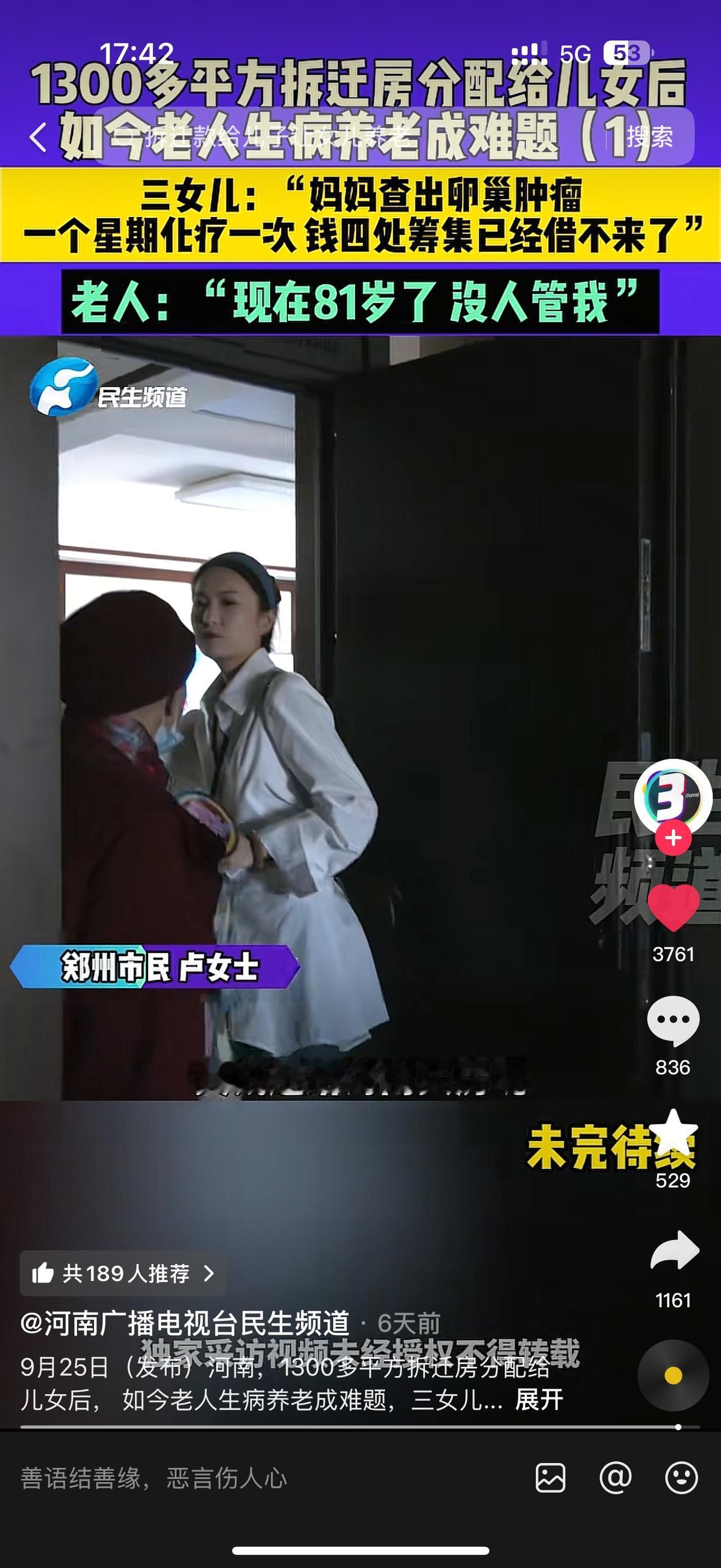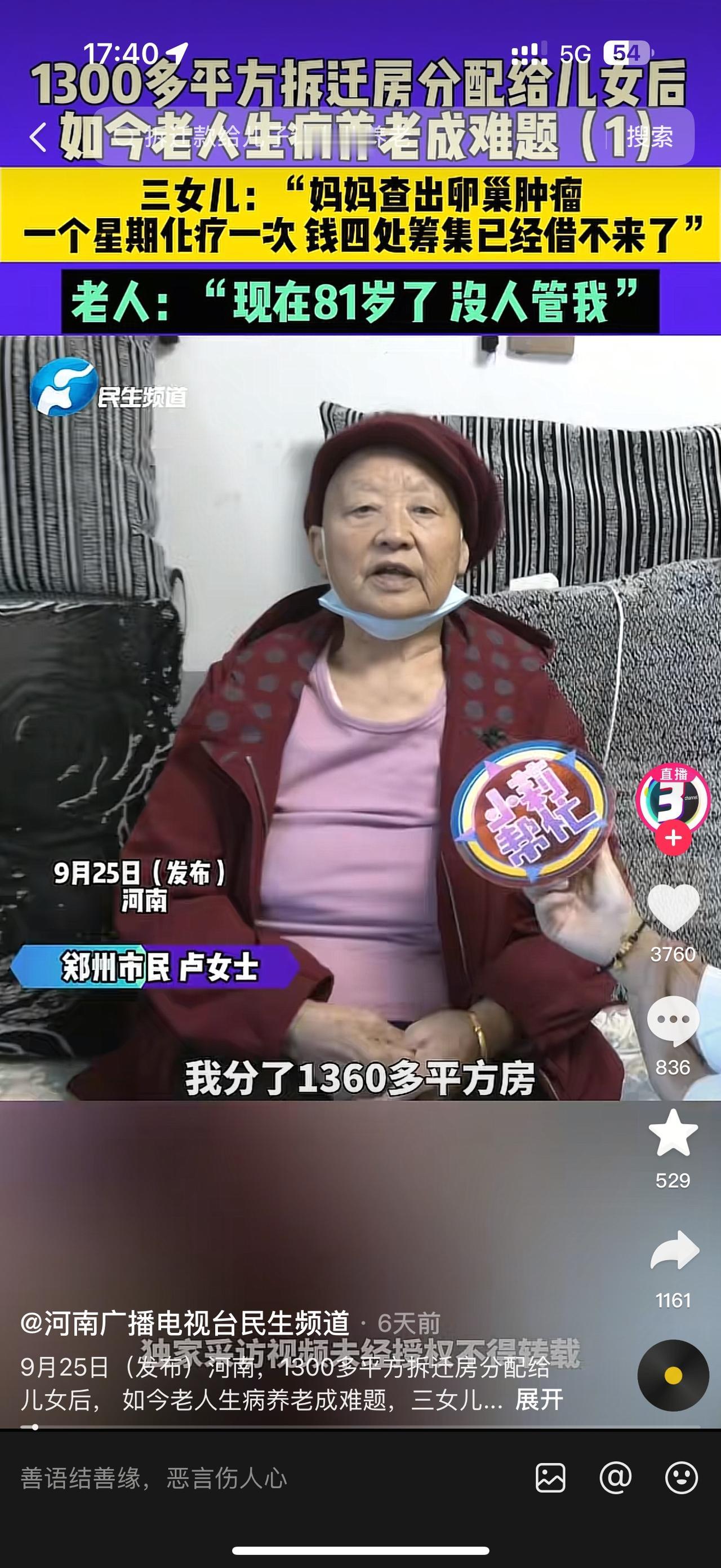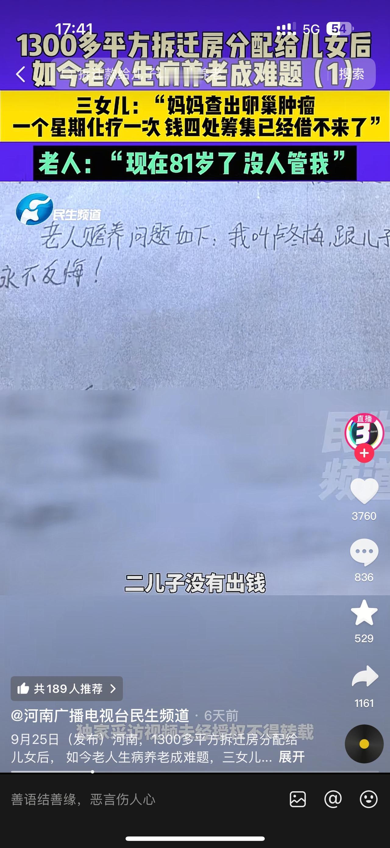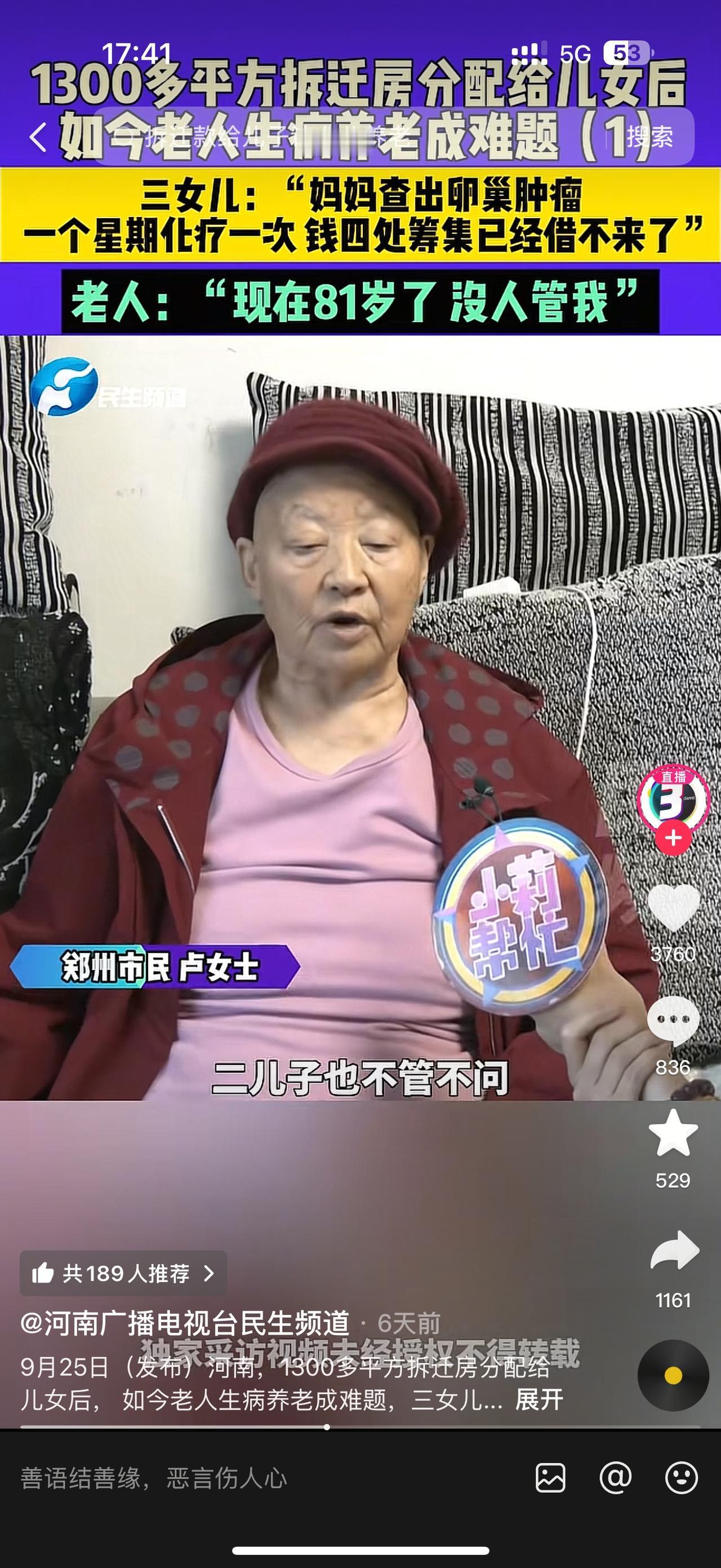 “禽兽都不如!”河南,一老奶奶靠祖上老宅,拆迁分得1300平米房子,市场价1000万左右,奶奶一高兴给了儿子,自己啥都没得,万万没想到,儿子心黑了,十多年根本不履行做儿子的赡养责任,无奈只好跟着小女儿生活,不巧是奶奶又查出大病,儿子一毛不拔,走头无路下,求助媒体,奶奶只有一个夙愿,最后也只能这么办。 2014年拆迁时,卢女士的地皮成了香饽饽。大女儿出了钱盖房,当初承诺“盖成了有你一半,我自己一半”,拆迁后卢女士便兑现承诺,给了大女儿一半的拆迁房。 剩下的一半在她名下,她又全给了没出一分钱的二儿子。三闺女呢? 老人只给了150平方米,还是在记者追问下才勉强提起。 “那纸上写的是和儿子一块生活,你现在咋跟着三闺女啊?”记者指着当年的赡养协议问。 卢女士叹了口气:“当时房子没回迁,儿子租的房小,孙女的姥姥在那住,我再去就挤不下了。后来房子回迁了,他也不管不问,我就一直跟着三闺女了。” 这一住就是十几年。三闺女李娟(化名)苦笑着点头:“从2018年妈摔断腿后,就基本在我这住了。”2023年,卢女士被查出卵巢肿瘤,一个星期要化疗一次,一个月下来光医药费就压得人喘不过气。 李娟四处借钱,头发都愁白了,可二哥李军(化名)却把她的微信拉黑了,母亲打电话也从不接,只有视频为证,记录下一次次无人接听的忙音。 记者在民事调解书上看到,李军自2023年1月起至2025年5月,需每月支付赡养费600元,共计3000元。 可卢女士抹着眼泪说:“一分钱没得到。” 为了弄清情况,记者跟着李娟找到了李军家。 开门的是李军的媳妇王兰(化名),她一脸不耐烦:“他经常跑大车出去了,很少回来。” 当被问及赡养费,王兰立刻诉起苦来:“欠人家一屁股债!五百多平的房子就剩这一套,装修钱还是借的。” 卢女士忍不住反驳:“欠钱你们还在海南买房?”王兰梗着脖子回:“海南的房是我娘家妈出的钱!” 王兰表示家里还有大学生要养,实在没钱,但愿意每月给600元赡养费,只是医药费暂时拿不出,让老人先缓一缓。这话彻底激怒了卢女士,双方吵了起来。 情绪激动之下,王兰突然给老人跪了下来,卢女士也跟着跪下,哭喊道:“我都81岁了,我能缓多久啊!”场面一度失控,好在记者及时劝住,双方才冷静下来。 记者尝试电话联系李军,却始终无人接听。卢女士绝望地说:“我不指望他多孝顺,就想要一套小房子自己住,三个孩子轮流照顾我就行。” 为了核实房产情况,记者给老人所在村村委会打了电话。 工作人员表示拆迁房已经下来了,只是还有一部分没分完,并明确表示:“不管老人给没给房子,赡养老人都是子女的义务。”工作人员答应帮忙把李军叫回来,一起协商解决问题。 如今,卢女士的化疗还在继续,李娟依旧每天打两份工凑医药费。 那张写满承诺的赡养协议,成了一张废纸;那些曾经被她视作“养老依靠”的房产,成了刺向她晚年的利刃。 她的遭遇,像一面镜子,照出了重男轻女观念下的悲哀,也照出了部分子女在利益面前的冷漠。 这场关于赡养的纠纷,不知还要拖到何时,但卢女士的眼泪,早已在提醒着世人:别让“偏心”,凉了最亲的人心;别让“利益”,丢了做人的根本。 信源:河南广播电视台民生频道 对此, 您怎么看?欢迎在下方评论区留言, 麻烦您点击一下“关注”和“点赞”方便您下次看到更加精彩的内容,祝您生活愉快,感谢支持。 免责声明: 文章内容以及图片皆来自官方媒体报道或第三方平台, 真实案例整合分享, 对于文章内容如有疑问或侵权行为,请联系本人进行修改或删除! ! !