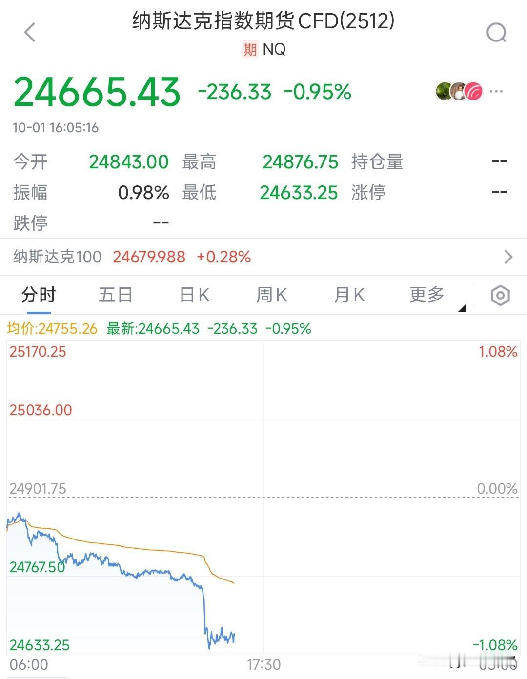还好A股在放假,美股今天将要崩盘的节奏 美股还没开盘,但是盘前指数期货全部大跌,纳斯达克指数期货大跌超过0.9%,道琼斯指数期货大跌超过0.6%,英伟达盘前跌1.2%,特斯拉盘前跌1.2%,苹果盘前跌将近1%。 主要原因就是从今天开始美股政府开始停摆了,经济数据公布不出来,全部陷入到了恐慌当中。 目前没有政府复工的消息,也就是说停摆将会持续下去。 美股的下跌会影响全球股市,不过A股在放假,等A股开盘的时候,美股的利空基本上已经消化干净了,不得不说这十一假放的是刚刚好