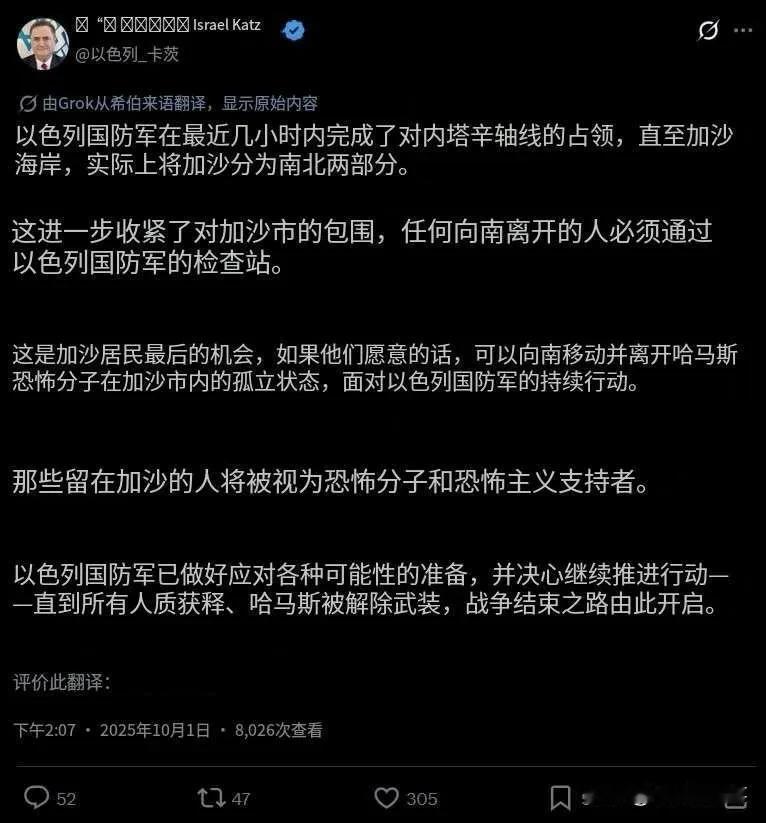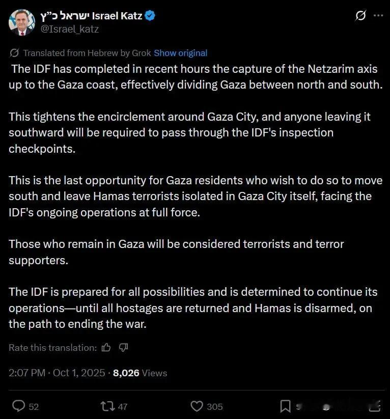 🇮🇱🇵🇸以色列国防部长卡茨表示,以色列国防军在过去几小时内完成了对内扎林战线至加沙海岸的控制,有效地将加沙分为南北两部分。 以色列 以军封锁加沙 硬刚以色列 以色列高官内讧