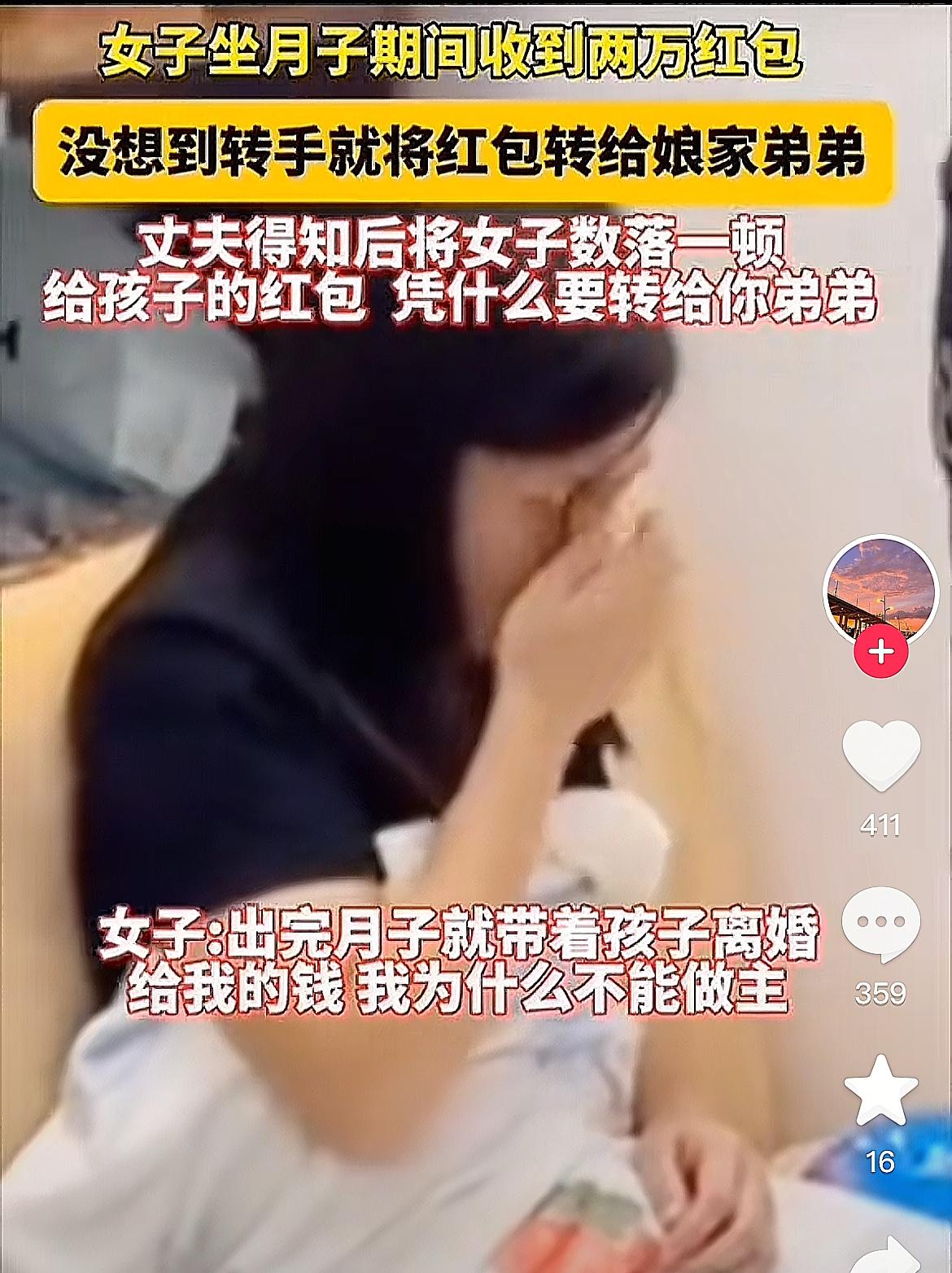 “女子坐月子期间收到2万红包,没想到转手就将红包转给了娘家弟弟。”丈夫得知后将女子数落了一顿,说:“给孩子的红包,凭什么转给你弟弟?”女子:“出完月子就带着孩子离婚,给我的钱,我为什么不能做主?” 先不说红包到底该归谁,妻子没和丈夫商量就转走大额钱款,确实没把伴侣当“一家人”;但丈夫上来就指责,没问清妻子是不是有难处,也少了点体谅 。 婚姻里最忌讳“我觉得”,红包是给产妇的慰问,还是给孩子的见面礼,提前说清楚就行。可偏偏一个闷头做决定,一个急着甩脸色,最后把小事闹成离婚导火索 。 要是你遇到这种情况,会先和伴侣沟通,还是直接按自己的想法来?来评论区说说你的处理方式 。