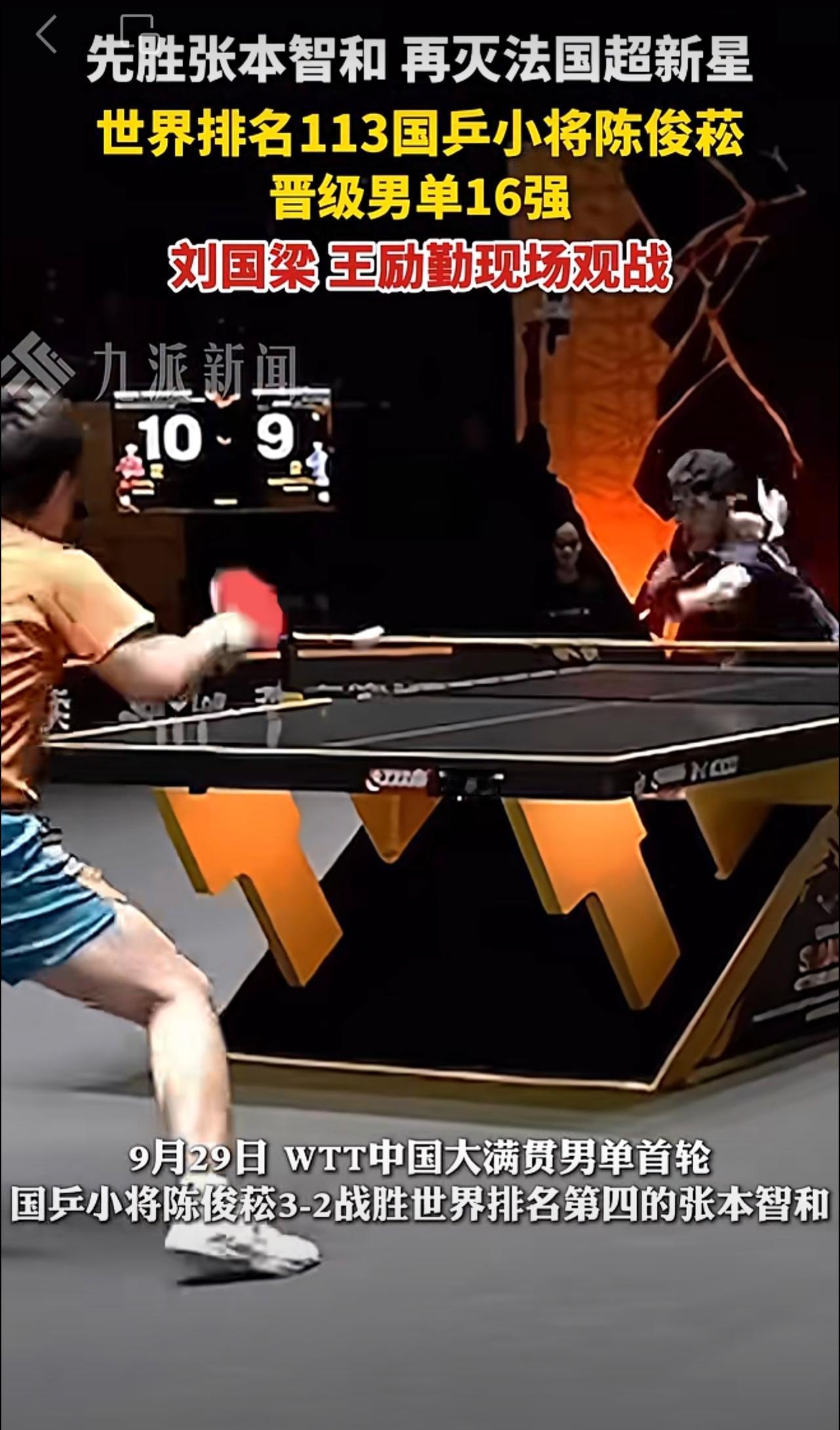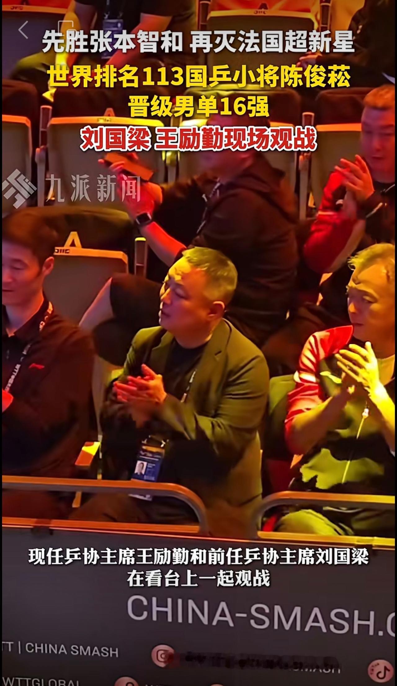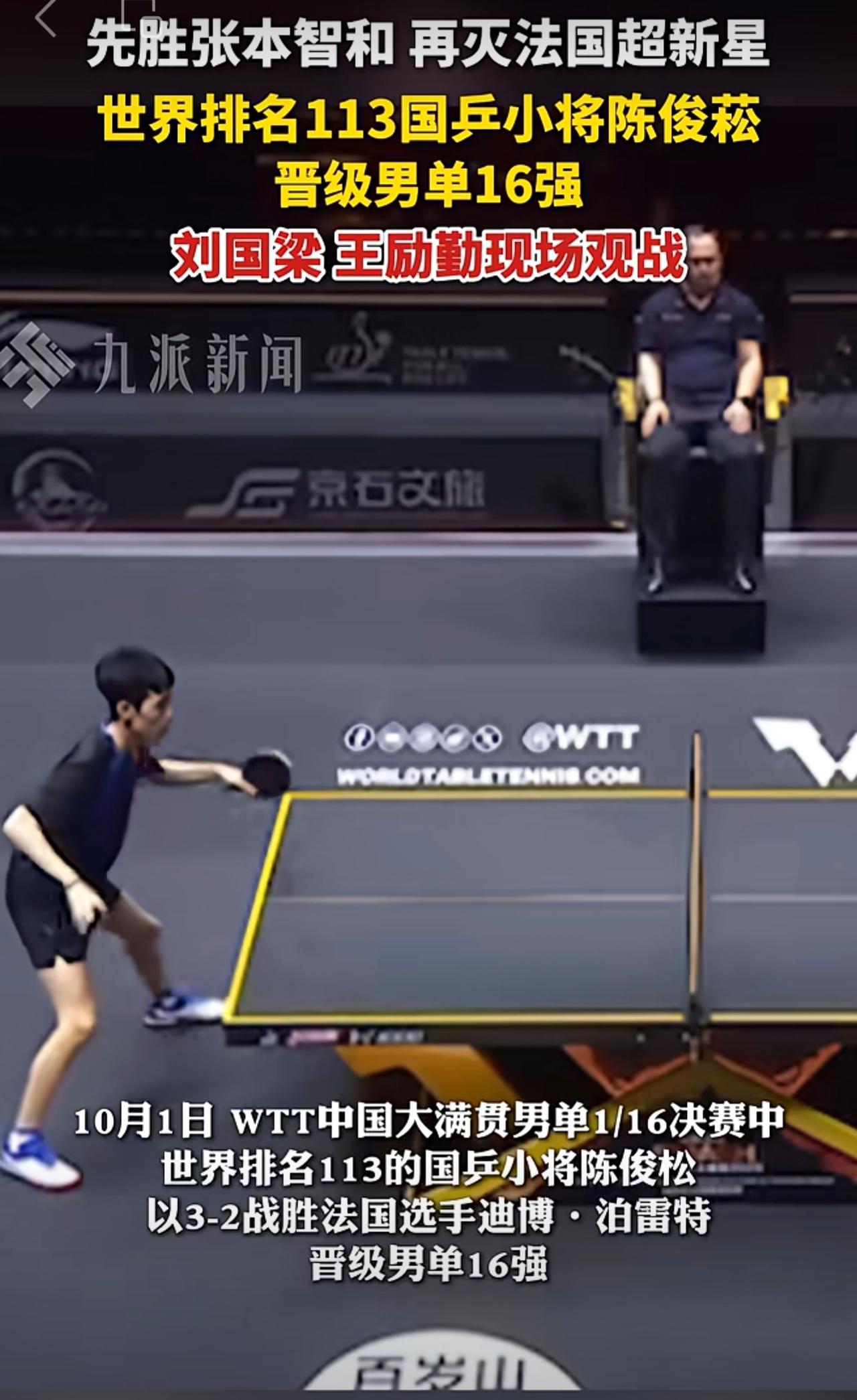 10月1日,陈俊菘先胜张本智和又赢法国新秀,陈俊菘晋级男单16强,刘国梁王励勤观