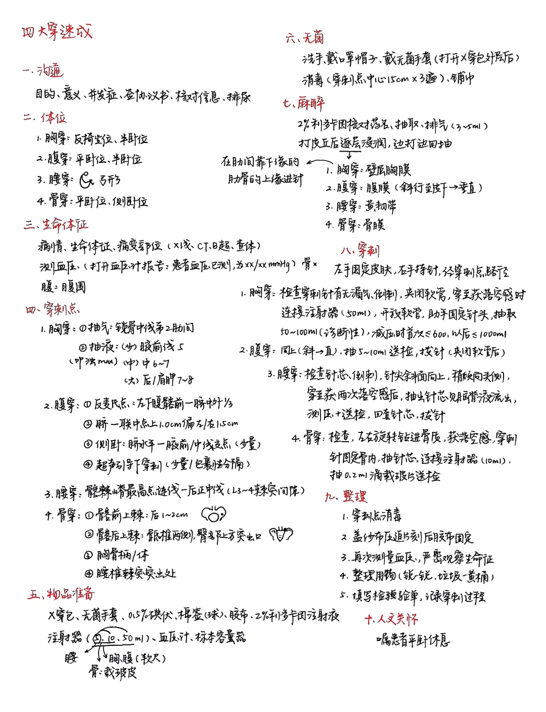 ✅今天整理了胸腹腰骨穿的共同流程 希望大家看完这页A4纸,考前都能快速掌握 没有细节到每句话说什么,只是起到一个方便回忆的模板作用(ˊ˘ˋ*)♡ ➡️无水印扫描版在第二张呀(*`▽´*) - 左栏是准备部分,右栏是操作部分 大框架来看就是十个步骤,需要背的知识点还是有点东西,每项技能也都有各自的一些小细节需要注意~不过看我们学校的考察表,评分标准也不是很高hhh
