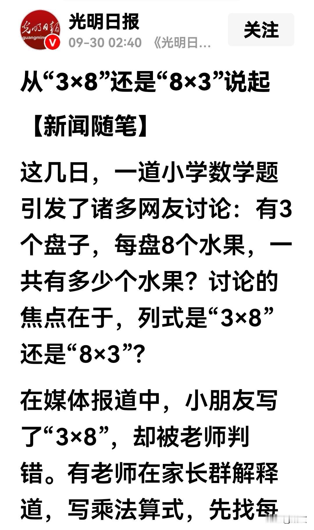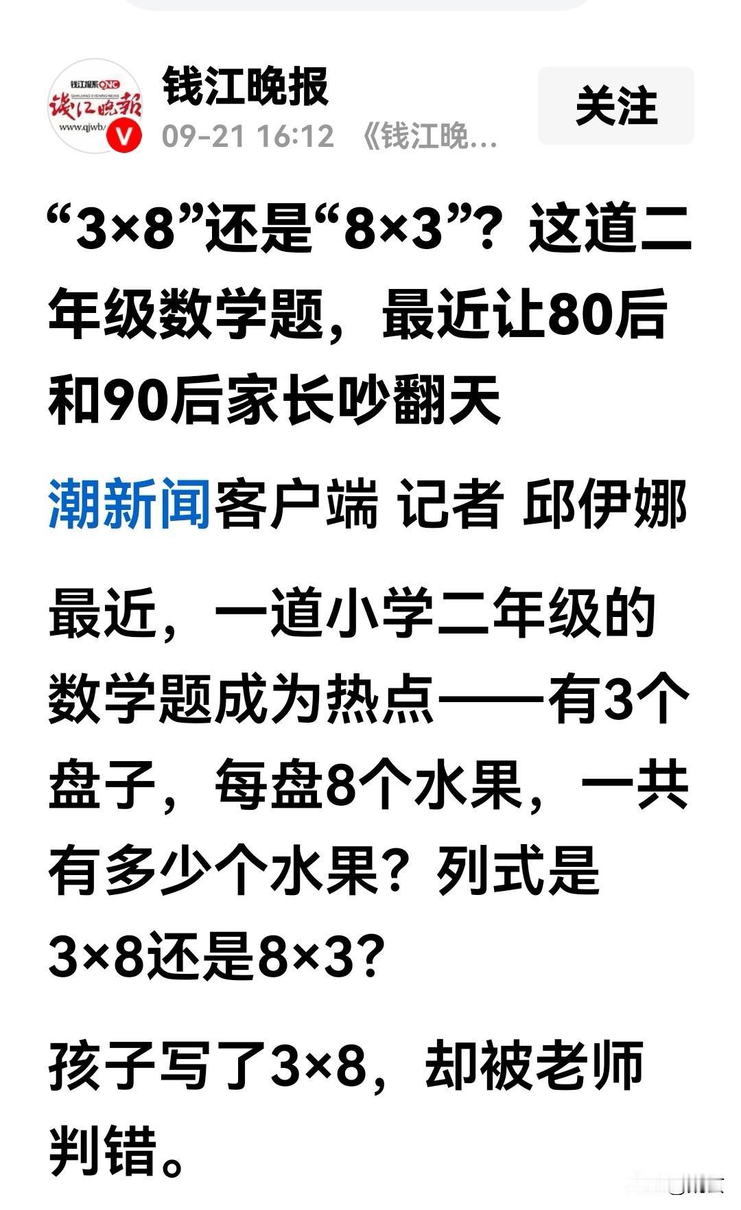 是3×8对,还是8×3对?不仅是个数学问题,更是个逻辑问题。 假如题目的表述是:一个盘子里装八个苹果,共有三个盘子,总共有多少苹果?则应为8×3 而表述为:有三个盘子,每个盘子装八个苹果,总共有多少苹果?为应为3×8 数学不仅是个工具,更是培养孩子逻辑能力的方法,题目怎么表述,就该有怎样的逻辑思维顺序。 所以报道中这个小学生的逻辑思维顺序完全正确,应该给他的做题打对号。 而这位老师僵化的强调谁是乘数?谁是被乘数?完全是教学水平低下,与标准答案无关。 一个题目的逻辑顺序不同,乘数和被乘数就变换了,而不是简单的以大小数论。 当然,说3×8 ,8×3都可以的人,是完全不懂教学的意义,也是谬论。