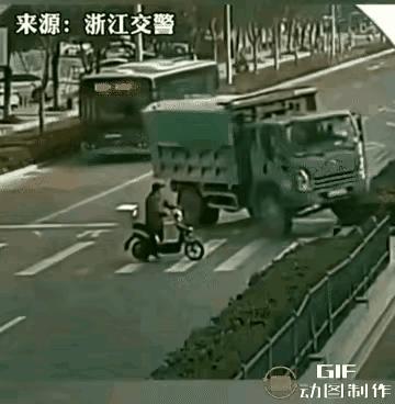 这个骑电动车过斑马线的男子很淡定也很幸运,关键时刻弃车,但是还是慢了一步,大货车
